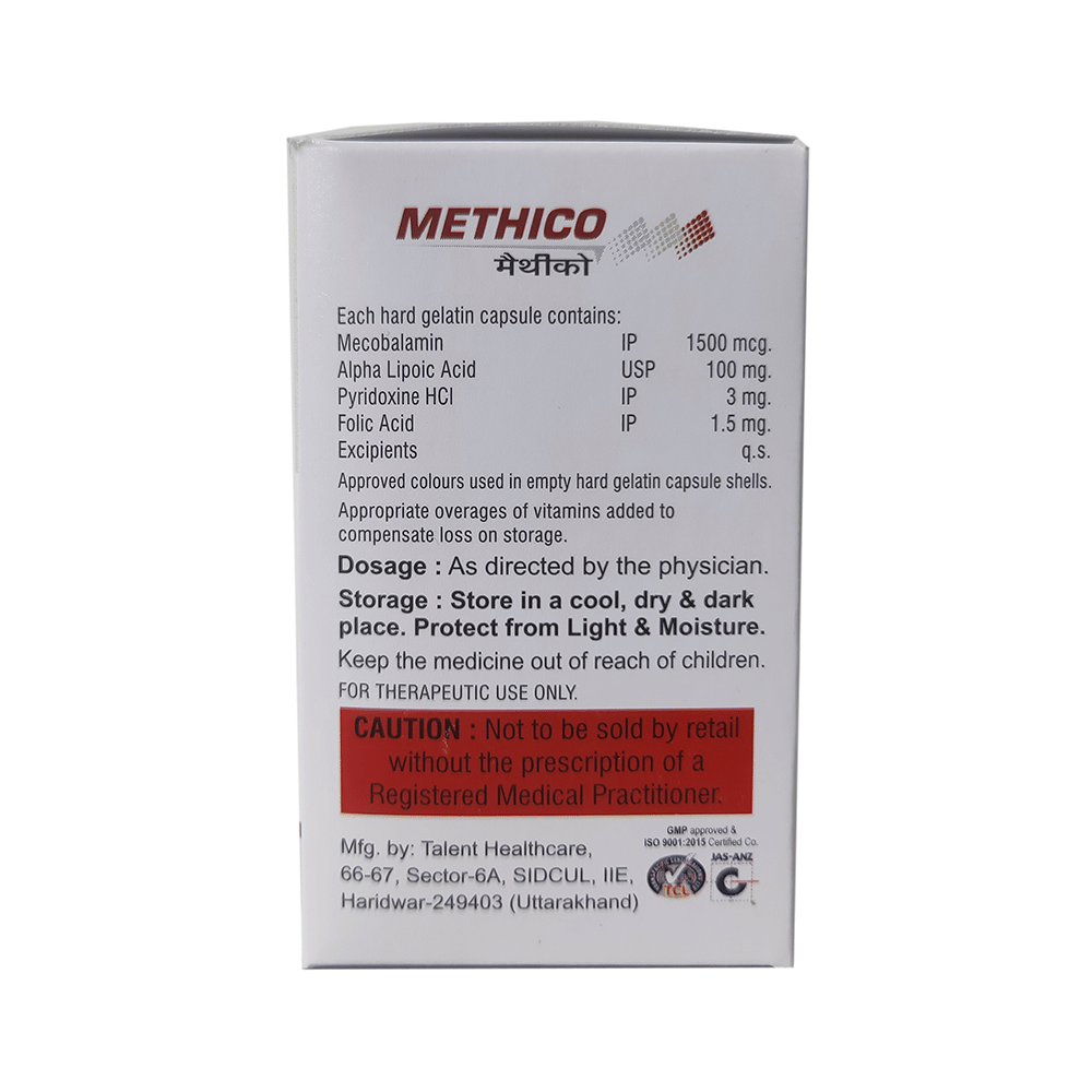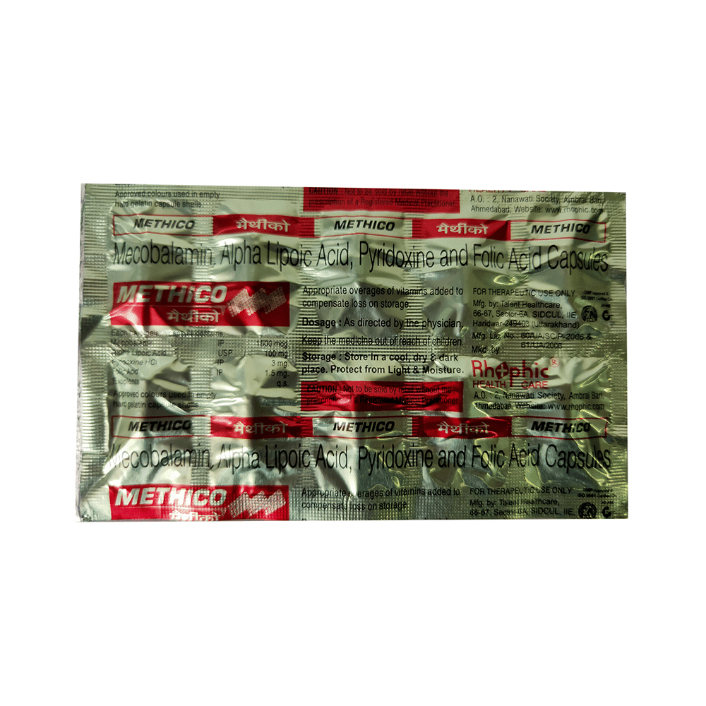 Methico Capsule is a combination of four nutritional supplements:Methylcobalamin, Alpha Lipoic Acid, Vitamin B6 (Pyridoxine) and Folic Acid which replenish the body's stores of important nutrients.