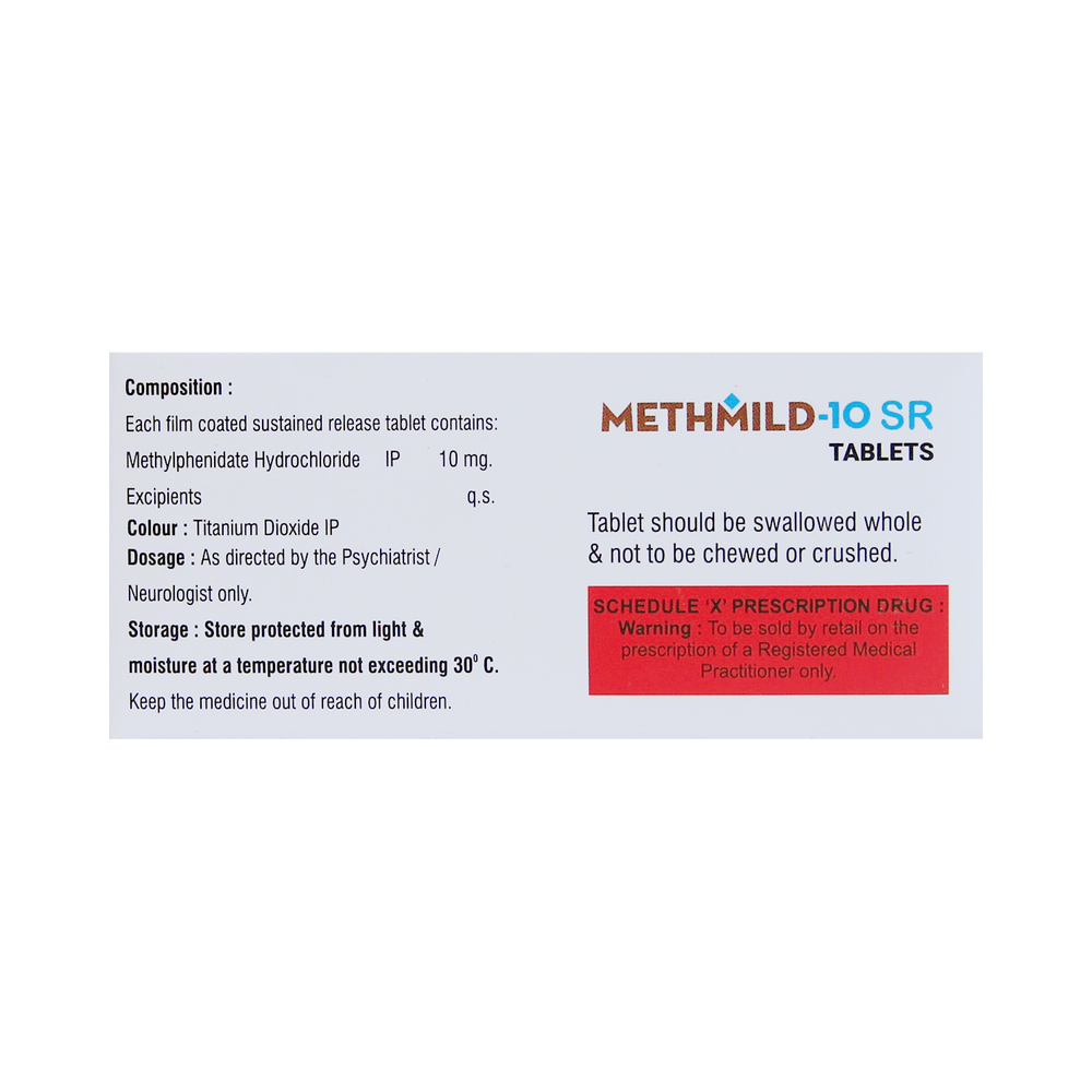 Methmild 10 SR Tablet is a medicine used in the treatment of attention deficit hyperactivity disorder (a behavioral disorder in children marked by poor concentration, hyperactivity, and learning difficulties). It helps to improve attention span, concentration and reduces impulsive behavior. Methmild 10 SR Tablet may be taken with or without food. It is advised to take this medicine at a fixed time each day to maintain a consistent level in the blood. If you miss any doses, take it as soon as you remember. Do not skip any doses and finish the full course of treatment even if you feel better. This medication mustn't be stopped suddenly as it may worsen your symptoms.Some common side effects of this medicine include headache, insomnia (difficulty sleeping), abdominal pain, and nervousness. However, these side effects are temporary and usually resolve on their own in some time. Please consult your doctor if these do not subside or bother you. This medicine causes dizziness and sleepiness, so do not drive or do anything that requires mental focus until you know how this medicine affects you.Before taking Methmild 10 SR Tablet, inform your doctor if you have any problems with your kidneys, heart, liver, or have a history of seizures (epilepsy or fits). Inform your doctor if you develop any unusual changes in mood or behavior, new or worsening depression, or if you have any suicidal thoughts.