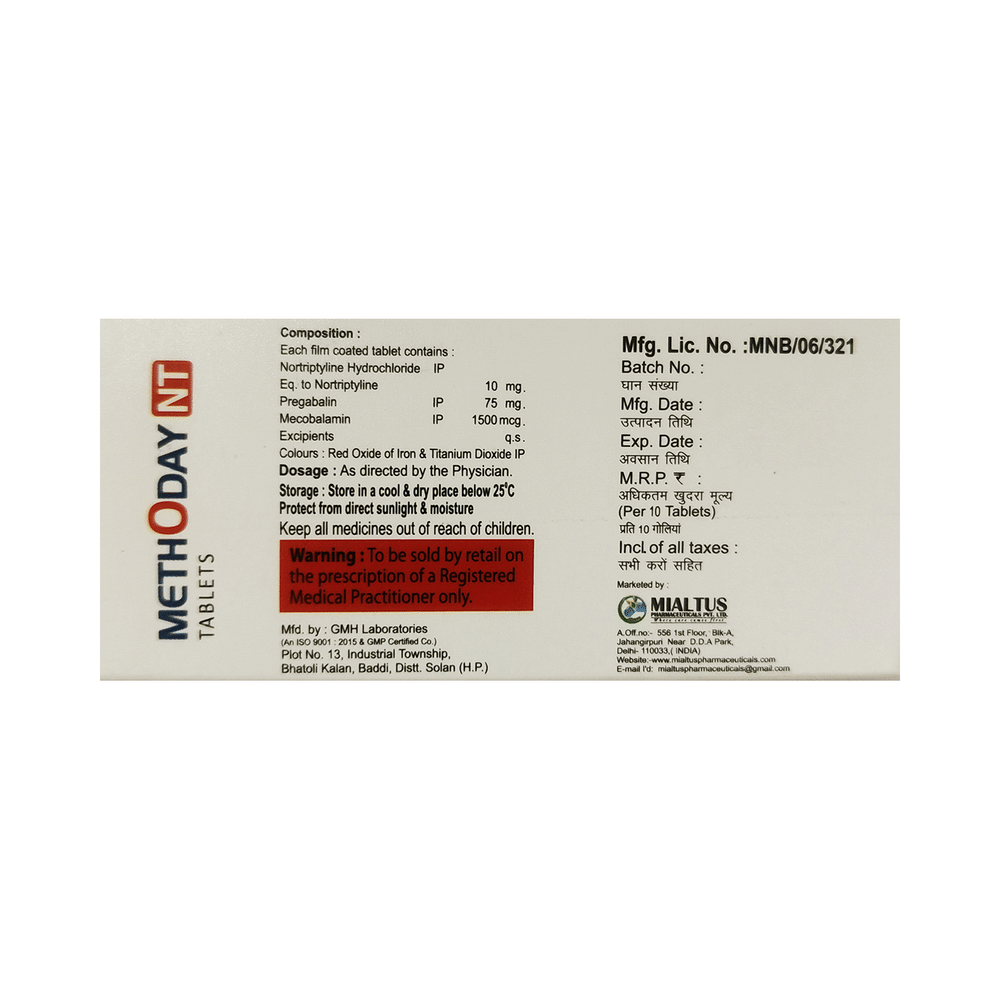 MethOday NT Tablet is a combination of three medicines: Pregabalin, Nortriptyline and Methylcobalamin. Pregabalin is an alpha 2 delta ligand which decreases pain by modulating calcium channel activity of the nerve cells. Nortriptyline is a tricyclic antidepressant which increases the levels of chemical messengers (serotonin and noradrenaline) that stop the movement of pain signals in the brain. Methylcobalamin is a form of vitamin B which helps in the production of myelin, a substance that protects nerve fibers and rejuvenates damaged nerve cells. Together, they relieve neuropathic pain (pain from damaged nerves).