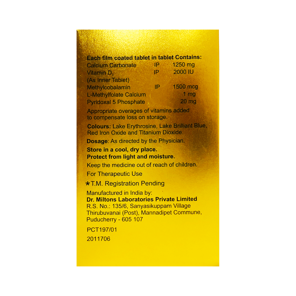 Salt Composition: Calcium Carbonate (1250mg) + Vitamin D3 (2000IU) + Methylcobalamin (1500mcg) + L-Methyl Folate Calcium (1mg) + Pyridoxal-5-phosphate (20mg)