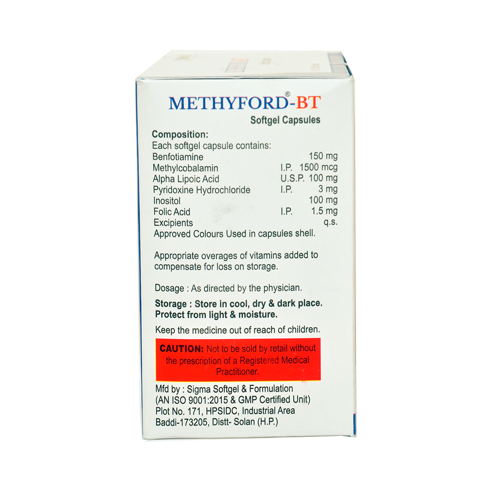 Methyford-BT Soft Gelatin Capsule is a multivitamin product. Benfotiamine (a form of vitamin B1) treats vitamin B1 deficiency and resulting nerve damage. Methylcobalamin corrects vitamin B12 deficiency thereby helping in treating certain anemias and nerve problems. Alpha-lipoic acid is an antioxidant that protects the brain and nerves from harmful free radicals. It lowers bad cholesterol. It breaks down carbohydrates to make energy. Pyridoxine Hydrochloride, a supplement of vitamin B6, is required by your body for utilization of energy in the foods you eat, production of red blood cells, and proper functioning of nerves. Inositol plays a role in cell signaling, insulin sensitivity, and neurotransmitter function. Folic acid is vitamin B9 that is essential for DNA synthesis and cell division. It also supports cardiovascular health and aids in the production of red blood cells.