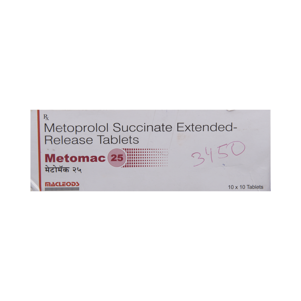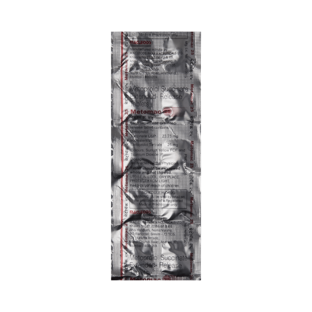 Metomac 25 Tablet ER belongs to a group of medicines called beta-blockers. It is used to treat high blood pressure (hypertension), angina (heart-related chest pain), and irregular heart rhythms (arrhythmia). It also helps prevent migraines, future heart attacks, and strokes. Metomac 25 Tablet ER may be prescribed alone or together with other medications. The dose and frequency will depend on what you are taking it for and the severity of your condition. It may be taken on an empty stomach or with a meal, but take it regularly at the same time each day to get the maximum benefit. It may take several weeks before you get the full benefit of this medicine, and you may need to take it for the rest of your life. However, it is important to continue taking it even if you feel well. Most people with high blood pressure do not have symptoms. If you stop taking it, your condition may worsen.The main side effects of Metomac 25 Tablet ER are tiredness, headache, depression, diarrhea, rash, slow heart rate, feeling dizzy, and nausea. These are usually mild and short-lived. It may also cause shortness of breath or low blood pressure in some people. To reduce the risk of side effects, your doctor will probably start the medicine at a low dose and gradually increase it. Consult your doctor if the side effects bother you or do not go away.Before taking it, let your doctor know if you have any liver problems. It may also not be suitable for people who have a slow heart rate, severe circulation problems, severe heart failure, or low blood pressure. Pregnant or breastfeeding mothers should also consult their doctor before taking it. You must talk to your doctor to find out whether this medicine is suitable for you to use. You should have your blood pressure checked regularly to make sure that this medicine is working properly. Avoid drinking alcohol, as it may increase certain side effects.