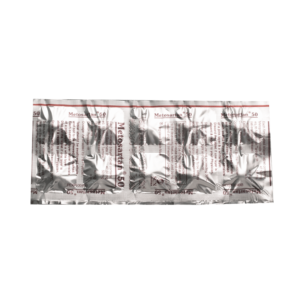 Metosartan 50 Tablet ER is a medicine used for treating high blood pressure. By lowering blood pressure, it helps in preventing future heart attacks and strokes. Early treatment with this medicine also improves the chances of survival in patients with heart attacks. It is advised to take Metosartan 50 Tablet ER with food at a fixed time each day to maintain consistent levels of medicine in the blood. Keep taking it for as long as advised by your doctor. Even if you feel well, do not stop this medicine on your own because high blood pressure often has no symptoms. If you stop taking it, your condition may get worse. Keeping active with regular exercise, reducing your weight and eating a healthy diet will also help control your blood pressure. Follow your doctor’s advice while taking this medicine.Some common side effects of this medicine include headache, weakness, dizziness, decreased blood pressure, increased potassium level in blood, orthostatic hypotension (occasionally with syncope), breathlessness, nausea, vomiting, abdominal pain, and fatigue. It is advised to avoid potassium rich food and supplements while taking this medicine. It may cause dizziness, avoid driving or rise slowly from the sitting position. You may be asked for regular monitoring of blood pressure, blood sugar level, kidney functioning, urea, or electrolytes level during the treatment.Before taking it, let your doctor know if you have any liver or kidney problems. Pregnant or breastfeeding women should also consult their doctor for advice before taking this medicine. You also need to tell your doctor what other medicines you are taking especially those used to treat high blood pressure or heart conditions.