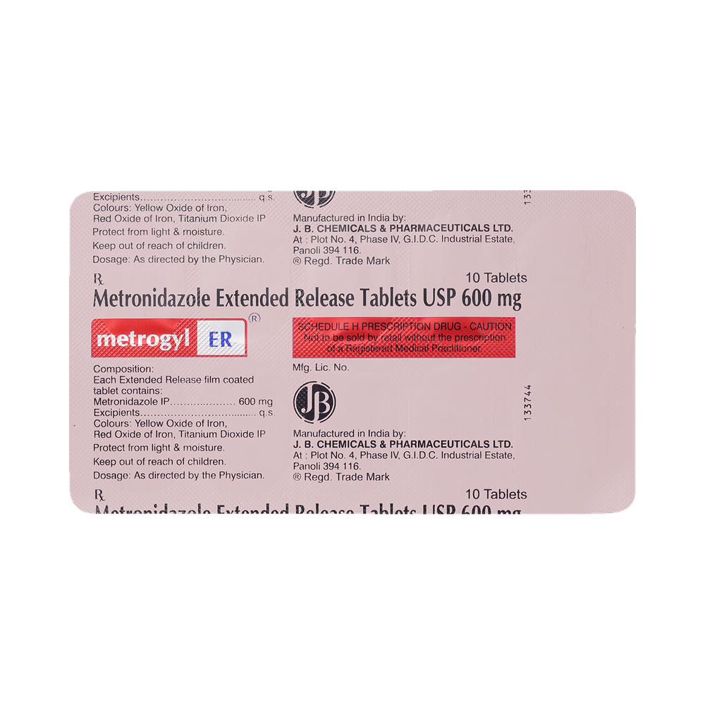 MEtrogyl ER Tablet is an antibiotic medicine that helps your body fight infections caused by bacteria and parasites. It is used to treat infections of the liver, stomach, intestines, vagina, brain, heart, lungs, bones, and skin. MEtrogyl ER Tablet helps prevent an infection after surgery. It is also used in the treatment of dental infections, leg ulcers and pressure sores. This medicine is best taken after eating some food. It should be taken at the same time each day to get the most benefit. The amount you are advised will depend on what you are being treated for and how bad it is, but you should take this antibiotic exactly as prescribed by your doctor. Your symptoms may get better after a short time but do not stop taking it until you have finished a full course of treatment, even if you feel well. If you stop taking it early, some bacteria may survive, and the infection may come back. Do not drink any alcohol while taking this medicine and for a few days after stopping it. Otherwise, you may get unpleasant side effects like nausea, vomiting and stomach pain.The most common side effects of this medicine are headache, dryness in mouth, nausea, and a slight metallic taste in the mouth. These are usually mild but let your doctor know if they bother you or last more than a few days. You can try using sugarless candies or lozenges to overcome any dryness or metallic taste in the mouth.Before using this medicine, inform your doctor if you are allergic to any medicine or have any kidney or liver problems or any disease of the nervous system. Your doctor may change the dose or prescribe a different medicine. This medicine should not be taken if you are pregnant or breastfeeding unless it is absolutely necessary and prescribed by your doctor. It may cause unusual results with certain medical tests. Therefore, tell any doctor who treats you that you are using this medicine.