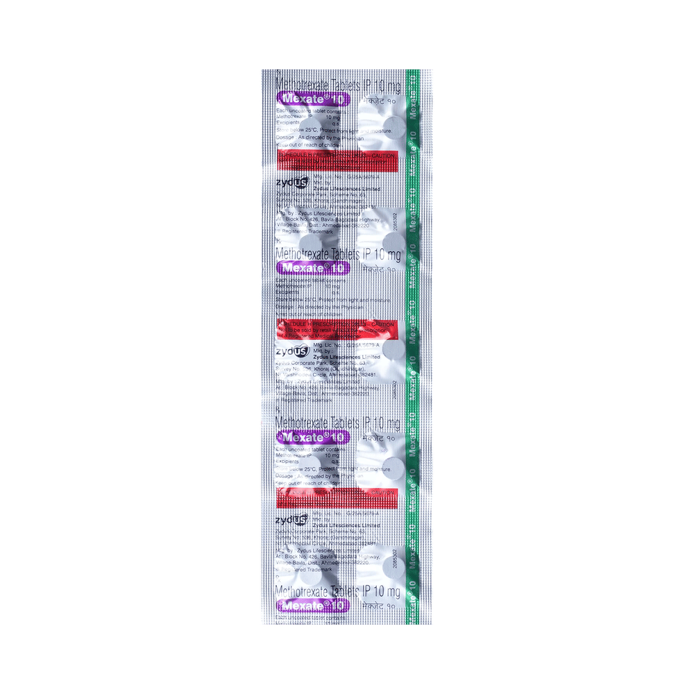MEXate 10 Tablet is a medicine used for the treatment of cancer in various parts of the body. It is also used to treat rheumatoid arthritis, severe and uncontrolled psoriasis, and Crohn’s disease. It works by slowing the growth of abnormal cells and reducing immune system activity in autoimmune conditions. MEXate 10 Tablet may be used alone or in combination with other medicines. You should take it exactly as your doctor has advised. Taking too much of it can cause serious side effects. It may take several weeks or months for you to see or feel the benefits, but do not stop taking it unless your doctor tells you to.The most common side effects of this medicine are ulcerative stomatitis, hair loss, low blood cell count, increased liver enzymes, nausea, and abdominal distress. Your doctor may advise you to take folic acid to reduce some of these. If they do not go away or get worse, tell your doctor. There may be ways of preventing or reducing these effects.MEXate 10 Tablet may lower your ability to fight infections and lead to problems with your blood, liver, or kidneys. Your doctor may perform several tests, such as blood tests, X-rays, and physical examinations, both before and during the treatment with this medicine to check for these problems.Before taking it, tell your doctor if you have problems related to the stomach, liver, or kidneys, or are taking any medicines to treat infections. Many other medicines can affect or be affected by this medicine, so let your doctor know about all your medications. This medicine is not recommended during pregnancy or while breastfeeding, as it may harm the baby. You should avoid consuming alcohol while taking this medicine, as it may increase your risk of liver damage.