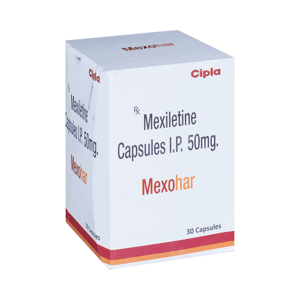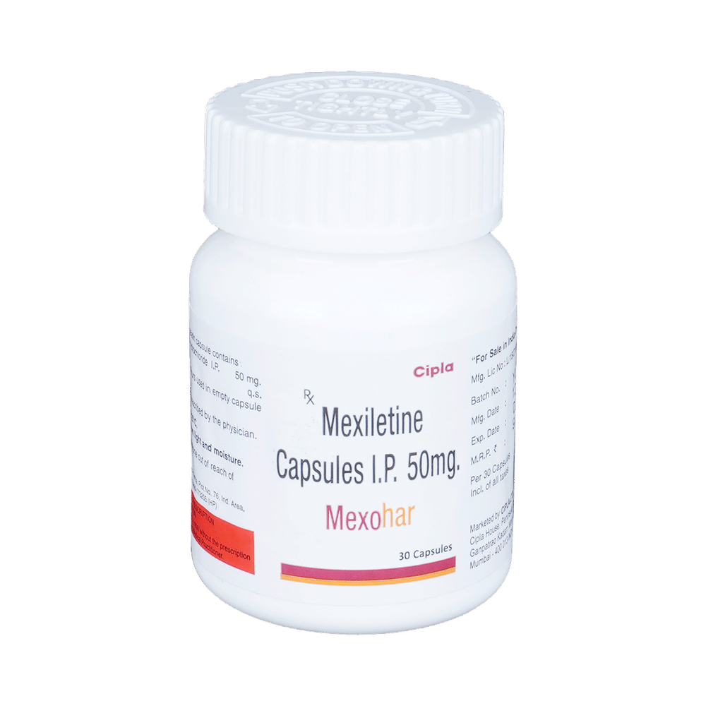 Mexohar 50mg Capsule is an anti-arrhythmic medicine used to treat certain types of arrhythmia (abnormal heart rhythm). It restores normal heart rhythm by blocking abnormal electrical signals in the heart. This helps to maintain a regular and steady heartbeat. Mexohar 50mg Capsule should be taken regularly as advised by the doctor. You should take it food and at a fixed time. This medicine should not be stopped abruptly without consulting the doctor as this can worsen your condition. Regular follow-up with your doctor is advised while using this medicine.Common side effects of this medicine include upper abdominal pain, lightheadedness, tremors, and impaired. Let your doctor know if you are bothered by any of these side effects or they get worse. Your doctor may also advise regular monitoring of liver and kidney function while you are taking this medicine.This medicine may not be suitable for some people. You must inform doctor if you are suffering from any severe heart, liver or kidney disease. Also let your doctor know about all the other medications that you are using regularly. This medicine is not usually recommended during pregnancy or breastfeeding, so always consult your doctor before taking it.
