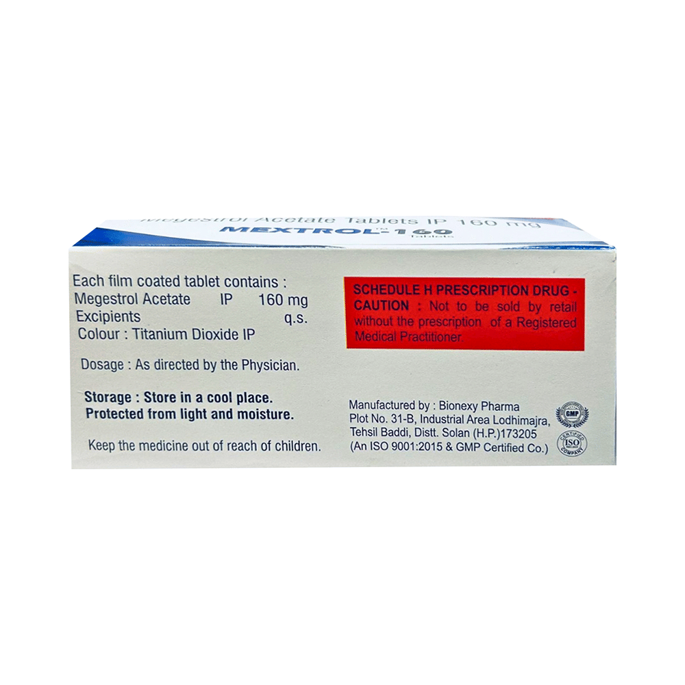 Mextrol 160 Tablet is used to treat breast cancer and endometrial cancer. It specifically helps treat breast and endometrial cancer that are hormone dependent. It may also be used for treating low appetite and weight loss in patients with advanced cancer or HIV. Mextrol 160 Tablet should be taken as your doctor advice. Your doctor will decide how much you need to take and for how much time. You may take it with or without food but better to take it at a fixed time. You should take this medicine for as long as it is prescribed for you.The most common side effects of this medicine include weight gain, increase in appetite, shortness of breath, hot flushes (warm face and neck), high blood pressure, and constipation. Most of these are temporary, and go away as soon as the body adjusts to the treatment. If any of these bothers you, let your doctor know. There may be ways of reducing or preventing them.Your doctor should also know about all other medicines you are taking as many of these may make this medicine less effective or change the way it works. Pregnant and breastfeeding women should not take this medicine. Your doctor might do regular blood tests to check your hormones and blood sugar levels while you are taking this medicine.