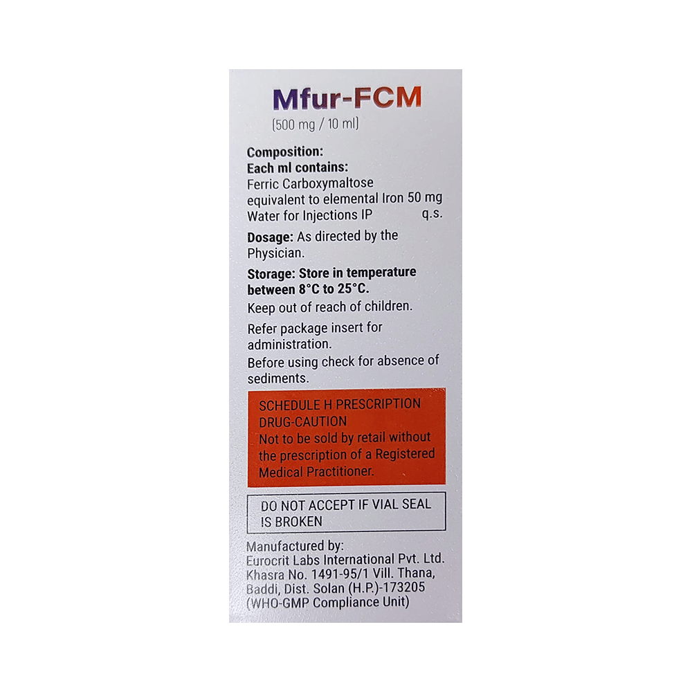 Mfur-FCM Injection is an iron replacement medicine used to treat iron deficiency anemia, a condition where the body lacks enough healthy red blood cells due to low iron levels. It is especially useful for people who cannot take oral iron supplements or those who need quick improvement in their iron levels. Mfur-FCM Injection is generally given by a doctor or nurse. It is important to follow your doctor's instructions carefully and attend all scheduled doses to ensure the treatment works effectively. While on treatment, eating a balanced diet that includes iron-rich foods can also support recovery. Do not stop or skip injections without medical advice, even if you start feeling better, as completing the full course helps restore and maintain healthy iron levels.Some people may experience mild side effects such as pain or swelling at the injection site, nausea, diarrhea, a metallic taste, or dizziness. These effects usually go away on their own, but if they bother you or worsen, let your doctor know. Rarely, allergic reactions like rash, itching, or difficulty breathing may occur. If you notice any serious symptoms after the injection, seek medical help immediately.Before starting Mfur-FCM Injection, inform your doctor if you have a history of allergies, liver disease, or infections, or if you are pregnant or breastfeeding. During treatment, avoid taking other iron supplements unless your doctor tells you to, as too much iron can be harmful. Also, let your doctor know about any other medicines you are taking to prevent possible drug interactions.