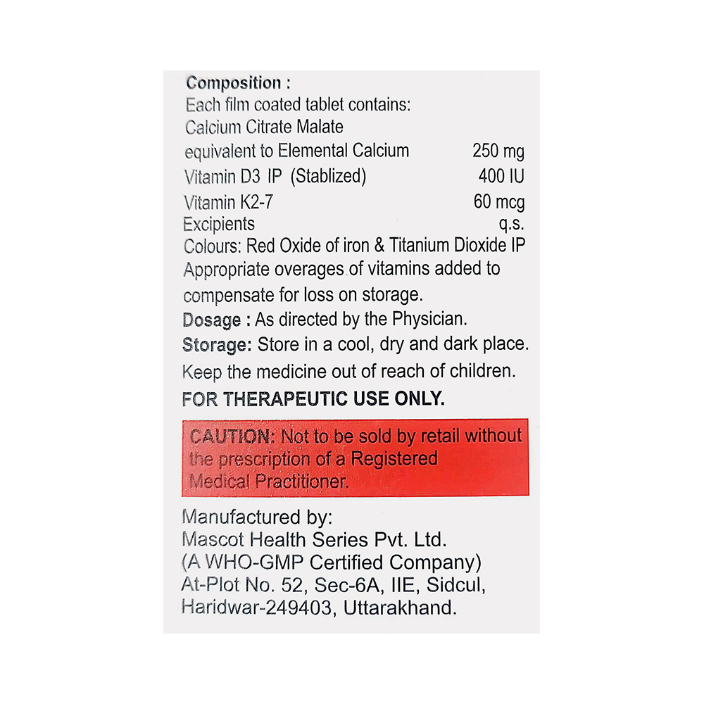 Salt Composition: Calcium Citrate Malate (250mg) + Vitamin D3 (400IU) + Vitamin K2-7 (60mcg)