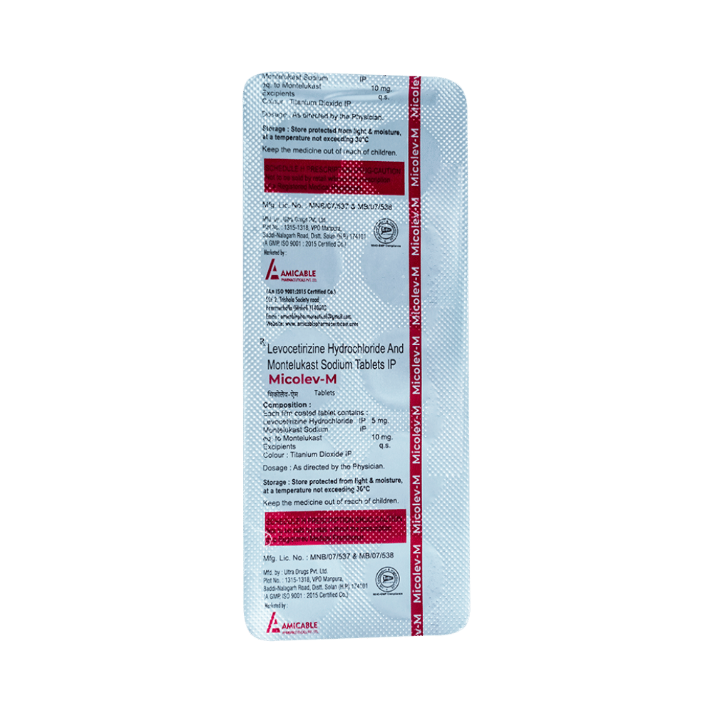 Micolev-M Tablet is a combination medicine used in the treatment of allergic symptoms such as runny nose, stuffy nose, sneezing, itching, swelling, watery eyes and congestion or stuffiness. It also reduces inflammation in the airways and make breathing easier. Micolev-M Tablet is taken with or without food in a dose and duration as advised by the doctor. The dose you are given will depend on your condition and how you respond to the medicine. You should keep taking this medicine for as long as your doctor recommends. If you stop treatment too early your symptoms may come back and your condition may worsen. Let your healthcare team know about all other medications you are taking as some may affect, or be affected by this medicine.The most common side effects are nausea, diarrhea, vomiting, dryness in the mouth, headache, skin rash, flu-like symptoms, and fatigue. Most of these are temporary and usually resolve with time. Contact your doctor straight away if you are at all concerned about any of these side effects. This medicine may cause dizziness and sleepiness, so do not drive or do anything that requires mental focus until you know how this medicine affects you. Avoid drinking alcohol while taking this medicine as it can worsen your sleepiness.Never support self-medication or recommend your medicine to another person. It is beneficial to have plenty of fluids while taking this medication. Before you start taking this medicine it is important to inform your doctor if you are suffering from kidney disease.