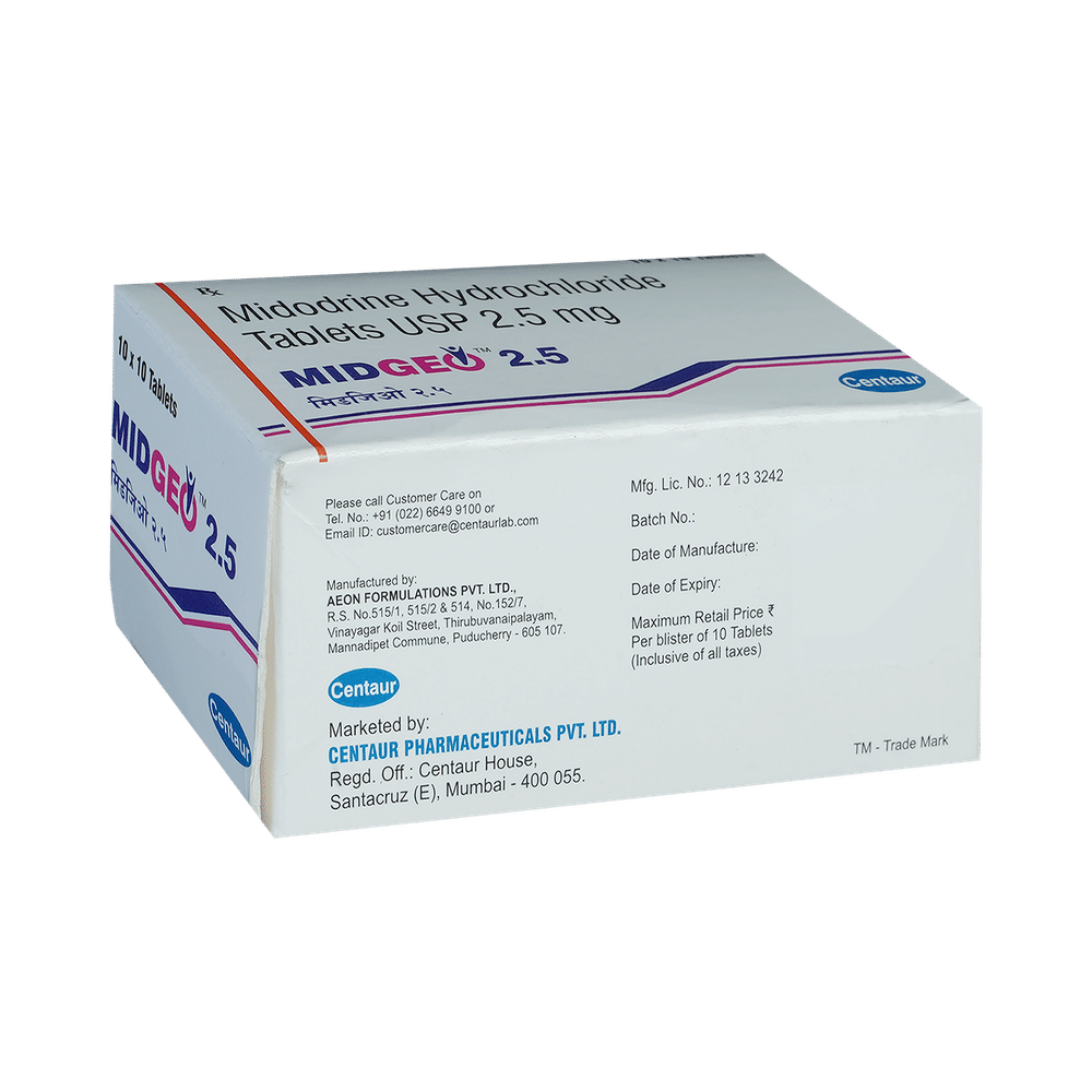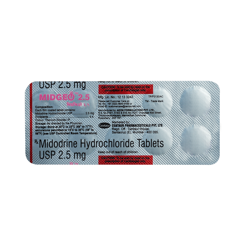 Midgeo Tablet is used to treat low blood pressure (hypotension). It is used in patients who experience dizziness due to low blood pressure while standing up suddenly from a sitting or lying position. This medicine causes tightening of blood vessels and results in an elevation of your blood pressure. Midgeo Tablet can be taken with or without food. This medicine is taken during daytime hours when people stand most often. But, it should not be taken if you are going to lie down for a long time after the dose. You should always take this medicine as advised by the doctor and should never stop it without consulting the doctor. You should monitor your blood pressure regularly while taking this medicine.Common side effects of this medicine include headache, nausea, rash, urinary retention, difficulty urination, and flushing. It may also cause supine hypertension, which is an increase in your blood pressure while lying down. Consult your doctor if these side effects bother you.Before taking this medicine, it is better to let your doctor know if you are suffering from any kidney or liver disease. Also, pregnant women and breastfeeding mothers should consult a doctor before taking it. You must inform the doctor about all the other medicines that you are taking apart from this medicine. Your doctor may ask for monitoring of kidney and liver function before and during the treatment with this medicine.