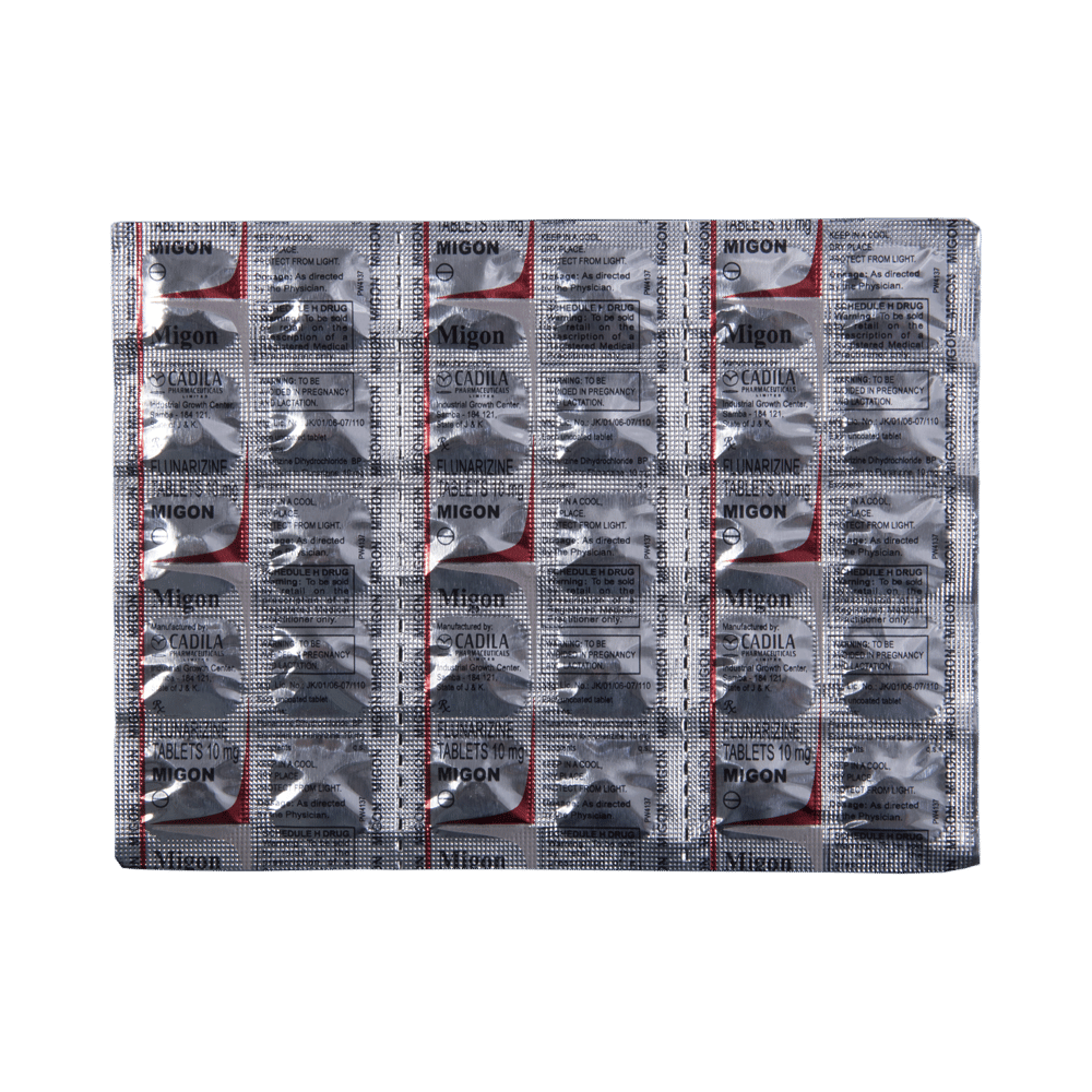 Migon Tablet is a medicine used for the prevention of migraines. However, it cannot treat an acute attack and will only work to prevent migraines for as long as you continue to take the medicine. This medicine relaxes the brain, preventing migraine headaches. Migon Tablet may be taken with or without food. However, it is advised to take it at the same time each day, as this helps maintain a consistent level of medicine in the body. Do not skip any doses, and finish the full course of treatment even if you feel better. If you have missed a dose, take it as soon as you remember. You should continue to take this medicine for as long as the doctor advises and do not stop taking it suddenly.Side effects associated with the use of Migon Tablet include muscle pain, fatigue, constipation, nausea, insomnia (difficulty sleeping), and a runny nose. Some other side effects that may be seen on taking this medicine are increased appetite, depression, stomach discomfort, and breast pain.Migon Tablet may also cause sleepiness at the beginning of your treatment, so do not drive or operate machinery until you know how this medicine affects you. It may also cause weight gain, and to prevent it, you can eat a healthy, balanced diet and exercise regularly. This medicine may cause changes in your mood, and you may feel depressed; therefore, regular monitoring of behavior is important. Pregnant or breastfeeding mothers should consult their doctor before taking this medicine.