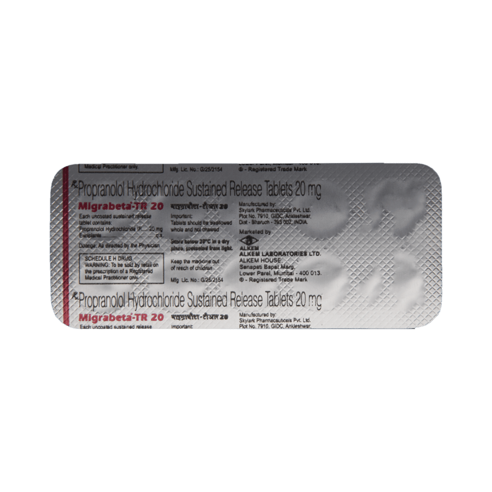 Migrabeta-TR 20 Tablet SR is a medicine used to prevent angina (chest pain) and migraine, and manage pheochromocytoma (a rare adrenal gland tumor). It works by slowing the heart rate and relaxing blood vessels, helping to reduce strain on the heart and improve blood flow. Take Migrabeta-TR 20 Tablet SR in the dose and duration prescribed by your doctor. It will depend on what you are being treated for and how you respond to the medicine. You should always take it as prescribed by the doctor. It can be taken with or without food. You should keep taking it even if you feel well, as you are still getting the benefits. If you stop taking it suddenly, your condition may worsen.The most common side effects of Migrabeta-TR 20 Tablet SR include tiredness, dizziness, weakness, cold fingers or toes, and stomach pain. You may also experience nausea, vomiting, and diarrhea. Talk to your doctor if the side effects bother you or do not go away. Most side effects are short-lived and improve as your body gets used to the medicine.You should not use Migrabeta-TR 20 Tablet SR if you have asthma, very slow or uneven heartbeats, or a serious heart condition, including heart failure. Talk to your doctor before taking it if you have kidney or liver problems or chronic obstructive pulmonary disease (COPD). In terms of lifestyle, alcohol may affect the way this medicine works and should be avoided. You should not drive if this medicine makes you feel dizzy. Ask your doctor whether it is safe to take this medicine if you are pregnant or breastfeeding.