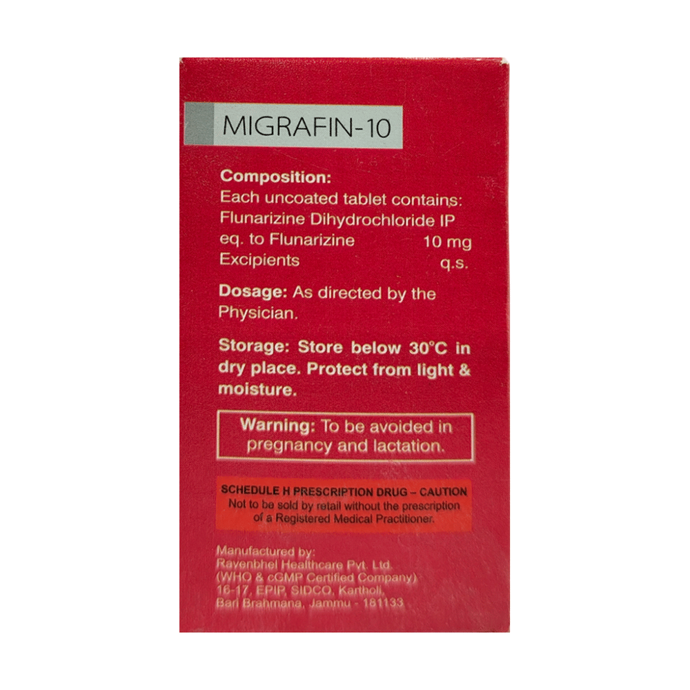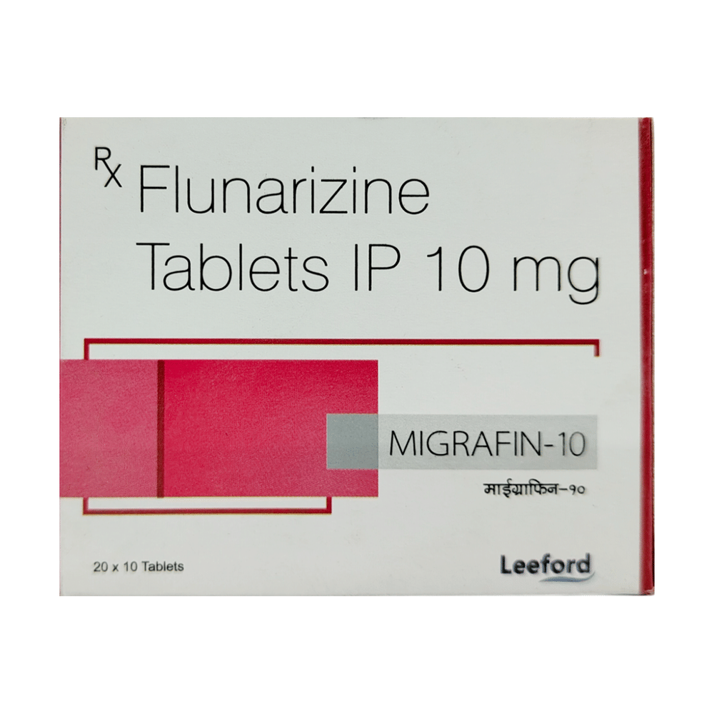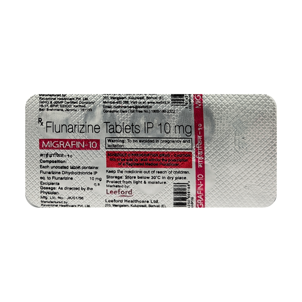Migrafin 10 Tablet is a medicine used for the prevention of migraines. However, it cannot treat an acute attack and will only work to prevent migraines for as long as you continue to take the medicine. This medicine relaxes the brain, preventing migraine headaches. Migrafin 10 Tablet may be taken with or without food. However, it is advised to take it at the same time each day, as this helps maintain a consistent level of medicine in the body. Do not skip any doses, and finish the full course of treatment even if you feel better. If you have missed a dose, take it as soon as you remember. You should continue to take this medicine for as long as the doctor advises and do not stop taking it suddenly.Side effects associated with the use of Migrafin 10 Tablet include muscle pain, fatigue, constipation, nausea, insomnia (difficulty sleeping), and a runny nose. Some other side effects that may be seen on taking this medicine are increased appetite, depression, stomach discomfort, and breast pain.Migrafin 10 Tablet may also cause sleepiness at the beginning of your treatment, so do not drive or operate machinery until you know how this medicine affects you. It may also cause weight gain, and to prevent it, you can eat a healthy, balanced diet and exercise regularly. This medicine may cause changes in your mood, and you may feel depressed; therefore, regular monitoring of behavior is important. Pregnant or breastfeeding mothers should consult their doctor before taking this medicine.