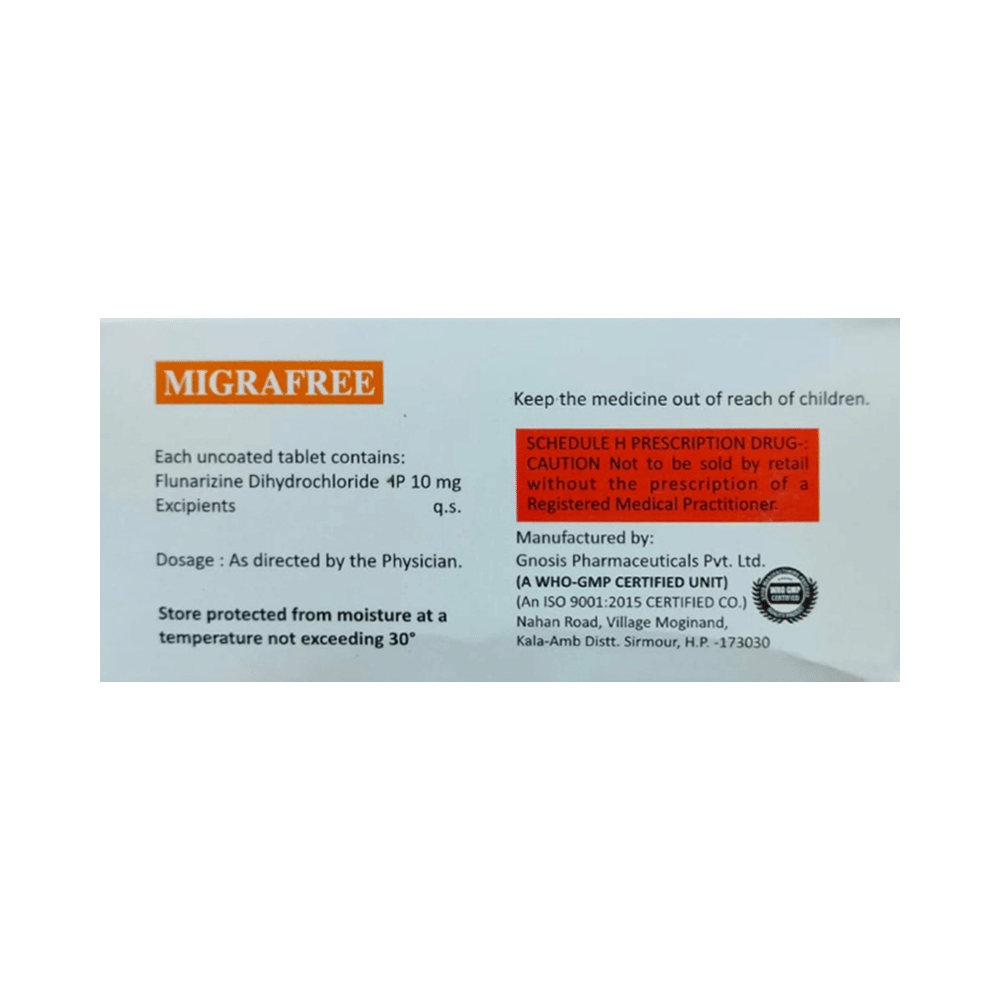 Migrafree Tablet is a medicine used for the prevention of migraines. However, it cannot treat an acute attack and will only work to prevent migraines for as long as you continue to take the medicine. This medicine relaxes the brain, preventing migraine headaches. Migrafree Tablet may be taken with or without food. However, it is advised to take it at the same time each day, as this helps maintain a consistent level of medicine in the body. Do not skip any doses, and finish the full course of treatment even if you feel better. If you have missed a dose, take it as soon as you remember. You should continue to take this medicine for as long as the doctor advises and do not stop taking it suddenly.Side effects associated with the use of Migrafree Tablet include muscle pain, fatigue, constipation, nausea, insomnia (difficulty sleeping), and a runny nose. Some other side effects that may be seen on taking this medicine are increased appetite, depression, stomach discomfort, and breast pain.Migrafree Tablet may also cause sleepiness at the beginning of your treatment, so do not drive or operate machinery until you know how this medicine affects you. It may also cause weight gain, and to prevent it, you can eat a healthy, balanced diet and exercise regularly. This medicine may cause changes in your mood, and you may feel depressed; therefore, regular monitoring of behavior is important. Pregnant or breastfeeding mothers should consult their doctor before taking this medicine.