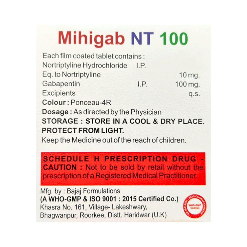 Mihigab NT 100 Tablet is a combination of two medicines: Gabapentin and Nortriptyline. Gabapentin is an alpha 2 delta ligand which decreases the pain by modulating calcium channel activity of the nerve cells. Nortriptyline is a tricyclic antidepressant which increases the levels of chemical messengers (serotonin and noradrenaline) that stop the movement of pain signals in the brain. Together, they relieve neuropathic pain (pain from damaged nerves).