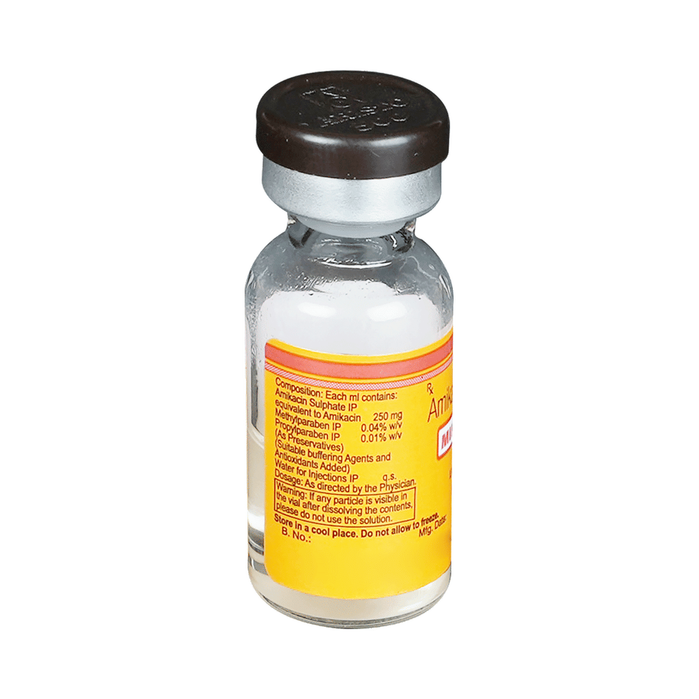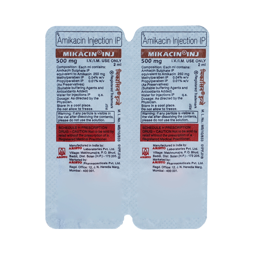 MIKacin 500mg Injection is an antibiotic used to prevent or treat various bacterial infections. These may include infections of the urinary tract, bones, joints, lungs (e.g., pneumonia), brain, blood, etc. It is also used in hospitalized patients to prevent infections. MIKacin 500mg Injection works by stopping the growth of bacteria. It is given as a drip (intravenous infusion) or as an injection directly into a vein or a muscle under the supervision of a doctor and should not be self-administered. It should be used regularly at evenly spaced time intervals as prescribed by your doctor. Do not skip any doses and finish the full course of treatment even if you feel better. Stopping the medicine too early may lead to the infection returning or worsening.Common side effects of this medicine include injection site reactions, kidney problems, and hearing problems. Consult your doctor if any of these side effects persist or if your condition does not improve despite treatment.Some patients receiving high doses may develop balance disorder (loss of balance), kidney damage, and hearing loss. Therefore, please follow all the instructions given by your doctor while using this medicine. Your doctor may also monitor you with regular kidney function tests, hearing tests, and urine tests during treatment. This medication is not recommended for use during pregnancy. Inform your doctor if you are pregnant, planning to conceive, or breastfeeding.