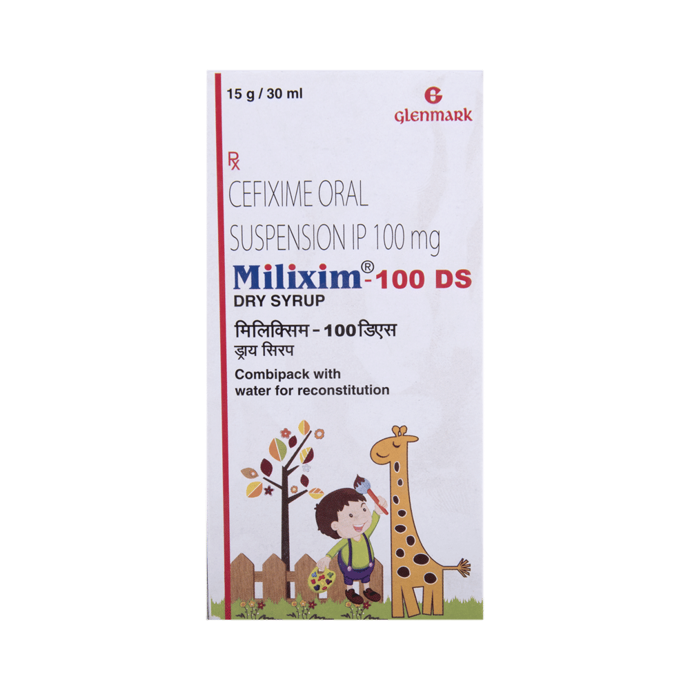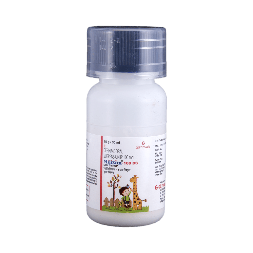 Milixim 100 DS Dry Syrup is an antibiotic belonging that is used to treat a variety of bacterial infections. It is effective in infections of the respiratory tract (eg. pneumonia), urinary tract, ear, nasal sinus, throat, and some sexually transmitted diseases. Milixim 100 DS Dry Syrup should be given under the supervision of a doctor or health professional. Use it regularly at evenly spaced intervals as per the schedule prescribed by your doctor. Using it at the same time every day will help you remember to take it. The dose will depend on what you are being treated for, but you should always complete the full course of this antibiotic as prescribed by your doctor. Do not stop taking it until you have finished, even when you feel better. If you stop taking it early, some bacteria may survive and the infection may come back or worsen. It will not work for viral infections such as flu or common cold. Using any antibiotic when you do not need it can make it less effective for future infections.The most common side effects of this medicine include nausea, stomach pain, indigestion, and diarrhea. These are usually mild but let your doctor know if they bother you or do not go away.Before taking it, you should let your doctor know if you are allergic to any antibiotics or have any kidney or liver problems. You should also let your healthcare team know all other medicines you are taking as they may affect, or be affected by this medicine. This medicine is generally regarded as safe to use during pregnancy and breastfeeding if prescribed by a doctor.