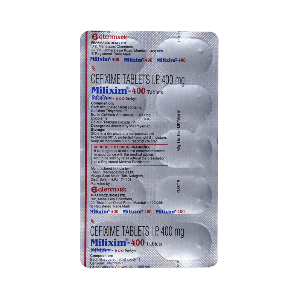 Milixim 400 Tablet is an antibiotic belonging that is used to treat a variety of bacterial infections. It is effective in infections of the respiratory tract (eg. pneumonia), urinary tract, ear, nasal sinus, throat, and some sexually transmitted diseases. Milixim 400 Tablet should be given under the supervision of a doctor or health professional. Use it regularly at evenly spaced intervals as per the schedule prescribed by your doctor. Using it at the same time every day will help you remember to take it. The dose will depend on what you are being treated for, but you should always complete the full course of this antibiotic as prescribed by your doctor. Do not stop taking it until you have finished, even when you feel better. If you stop taking it early, some bacteria may survive and the infection may come back or worsen. It will not work for viral infections such as flu or common cold. Using any antibiotic when you do not need it can make it less effective for future infections.The most common side effects of this medicine include nausea, stomach pain, indigestion, and diarrhea. These are usually mild but let your doctor know if they bother you or do not go away.Before taking it, you should let your doctor know if you are allergic to any antibiotics or have any kidney or liver problems. You should also let your healthcare team know all other medicines you are taking as they may affect, or be affected by this medicine. This medicine is generally regarded as safe to use during pregnancy and breastfeeding if prescribed by a doctor.