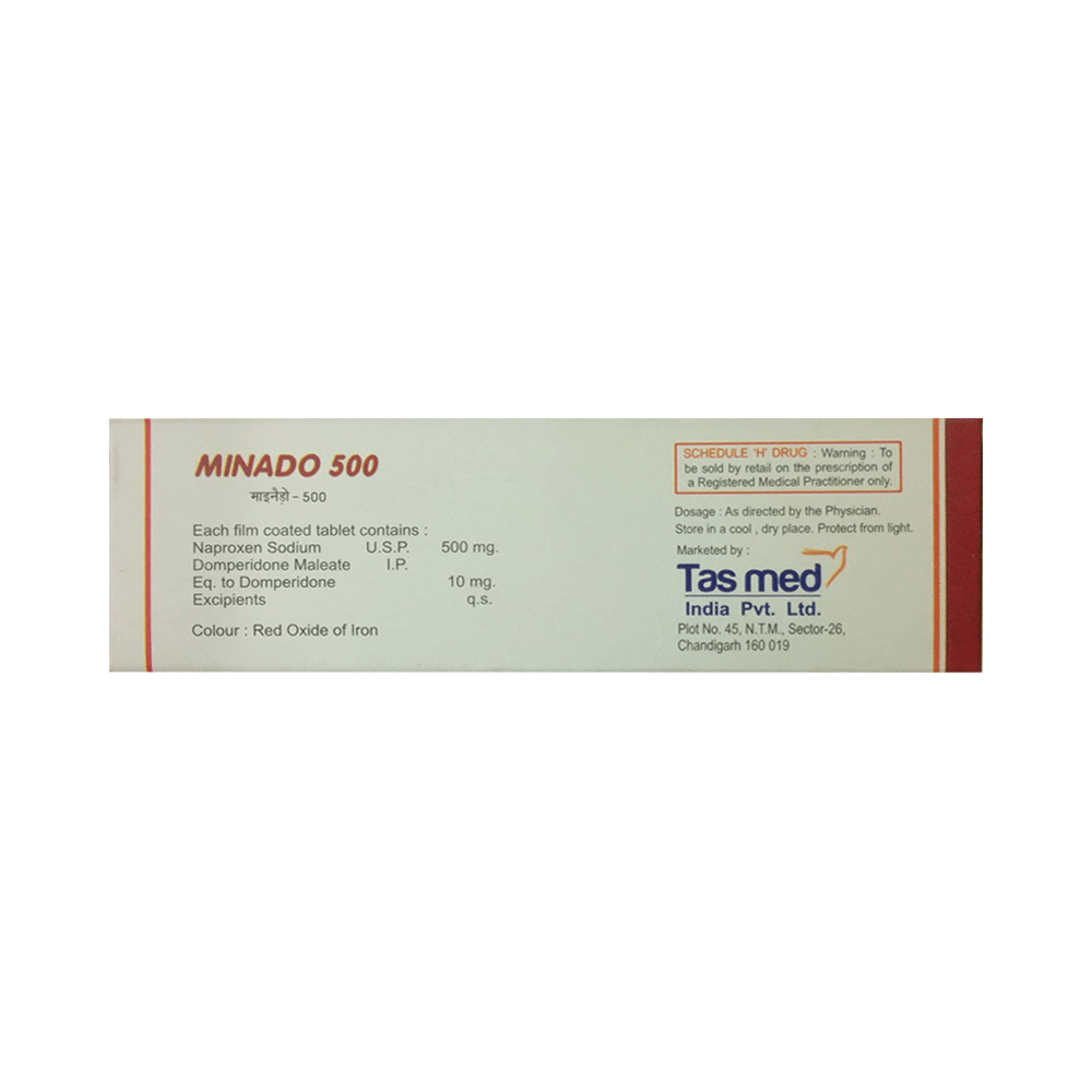Minado 500 Tablet is a combination of two medicines: naproxen and domperidone. Naproxen is a non-steroidal anti-inflammatory drug (NSAID) that works by blocking the release of certain chemical messengers that cause pain due to migraine. Domperidone works on the region in the brain that controls vomiting associated with migraine. Together, they provide relief from migraine symptoms.