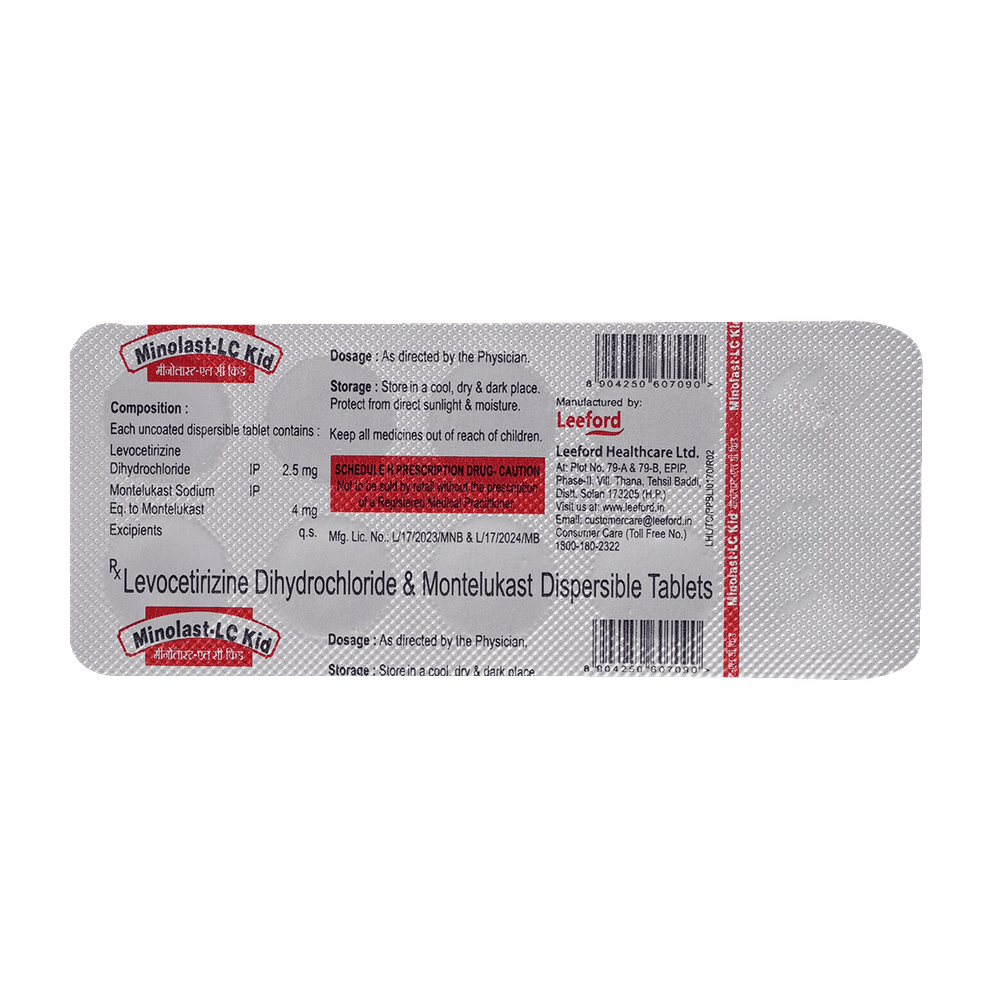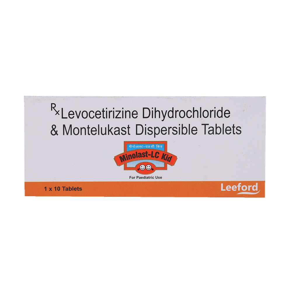 Minolast Kid 2.5mg/4mg Tablet is commonly prescribed in children to treat symptoms of allergy such as runny nose, sneezing, itching, swelling, congestion, and watery eyes. It may also help in the treatment of asthma and skin allergies. Give this medicine to your child at a fixed time before or after food in the prescribed dose, time, and way. For asthma, prefer giving Minolast Kid 2.5mg/4mg Tablet in the evening or 2 hours before physical activity. For allergy, it is best to give it either in the morning or in the evening, depending upon the time of onset of symptoms. In case your child has both, prefer giving it in the evening. If your child vomits within 30 minutes of taking this medicine, give the same dose again, but skip it if it’s already time for the next dose.Your child may start to feel better after a few regular doses. However, you must still complete the prescribed dose to ensure maximum benefit. Moreover, stopping the medicine abruptly may worsen your child’s condition. This medicine may cause some minor and temporary side effects like vomiting, diarrhea, nausea, dizziness, dry mouth, rash, and headache. Usually, these episodes subside once your child’s body adapts to the medicine. However, in case these effects persist or start bothering your child, consult your child’s doctor without any delay.Let your child’s doctor know if your child is already taking any medicines. Also, narrate your child’s complete medical history, including any prior episodes of allergy, heart problem, blood disorder, vascular disorders, birth defects, airway obstruction, lung anomaly, skin disorder, liver impairment, and kidney malfunction. This information is critical for dose alterations and in planning your child’s overall treatment.