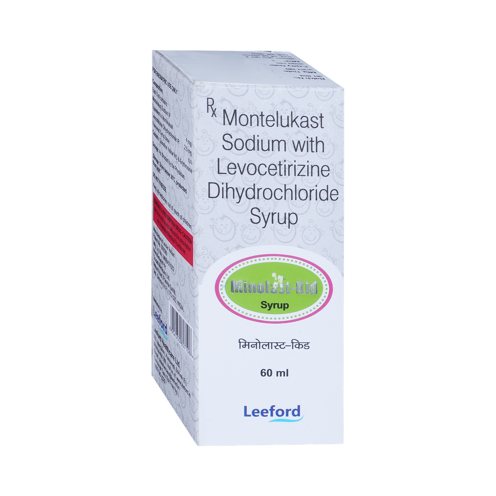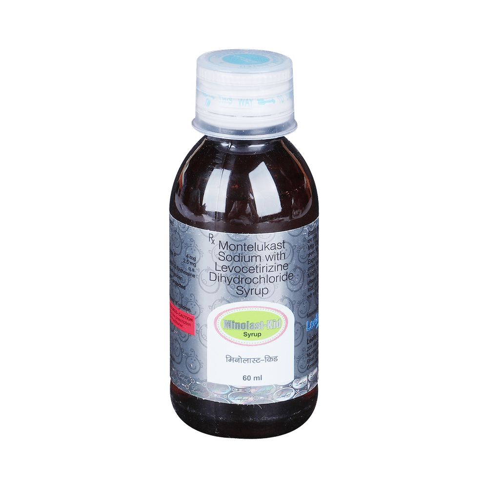 Minolast -Kid Syrup is commonly prescribed in children to treat symptoms of allergy such as runny nose, sneezing, itching, swelling, congestion, and watery eyes. It may also help in the treatment of asthma and skin allergies. Give this medicine to your child at a fixed time before or after food in the prescribed dose, time, and way. For asthma, prefer giving Minolast -Kid Syrup in the evening or 2 hours before physical activity. For allergy, it is best to give it either in the morning or in the evening, depending upon the time of onset of symptoms. In case your child has both, prefer giving it in the evening. If your child vomits within 30 minutes of taking this medicine, give the same dose again, but skip it if it’s already time for the next dose.Your child may start to feel better after a few regular doses. However, you must still complete the prescribed dose to ensure maximum benefit. Moreover, stopping the medicine abruptly may worsen your child’s condition. This medicine may cause some minor and temporary side effects like vomiting, diarrhea, nausea, dizziness, dry mouth, rash, and headache. Usually, these episodes subside once your child’s body adapts to the medicine. However, in case these effects persist or start bothering your child, consult your child’s doctor without any delay.Let your child’s doctor know if your child is already taking any medicines. Also, narrate your child’s complete medical history, including any prior episodes of allergy, heart problem, blood disorder, vascular disorders, birth defects, airway obstruction, lung anomaly, skin disorder, liver impairment, and kidney malfunction. This information is critical for dose alterations and in planning your child’s overall treatment.