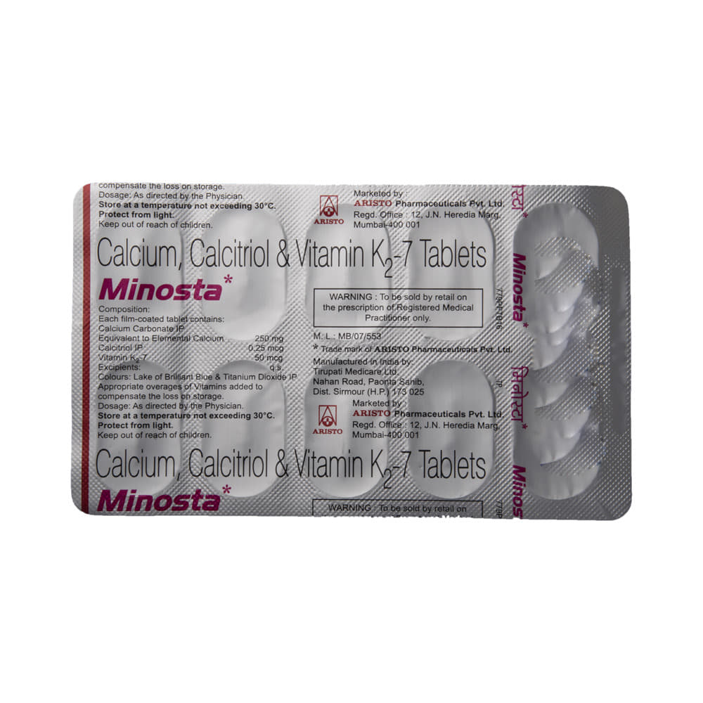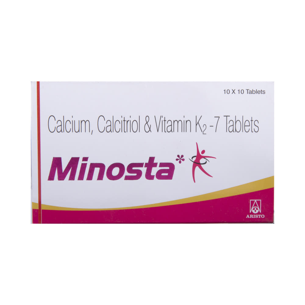 Minosta Tablet is a combination of Calcitriol, Calcium Carbonate, and Vitamin K2-7. Calcitriol is the active form of Vitamin D. It raises Vitamin D levels in your blood. This in turn raises calcium levels in your blood by helping you absorb more calcium from your intestine. Calcium carbonate is a dietary supplement used when the amount of calcium taken in the diet is not enough. Vitamin K2-7 plays a central role in the metabolism of calcium, the main mineral found in your bones and teeth. Vitamin K2-7 activates the calcium-binding actions of two proteins : matrix GLA protein and osteocalcin, which help to build and maintain bone health.