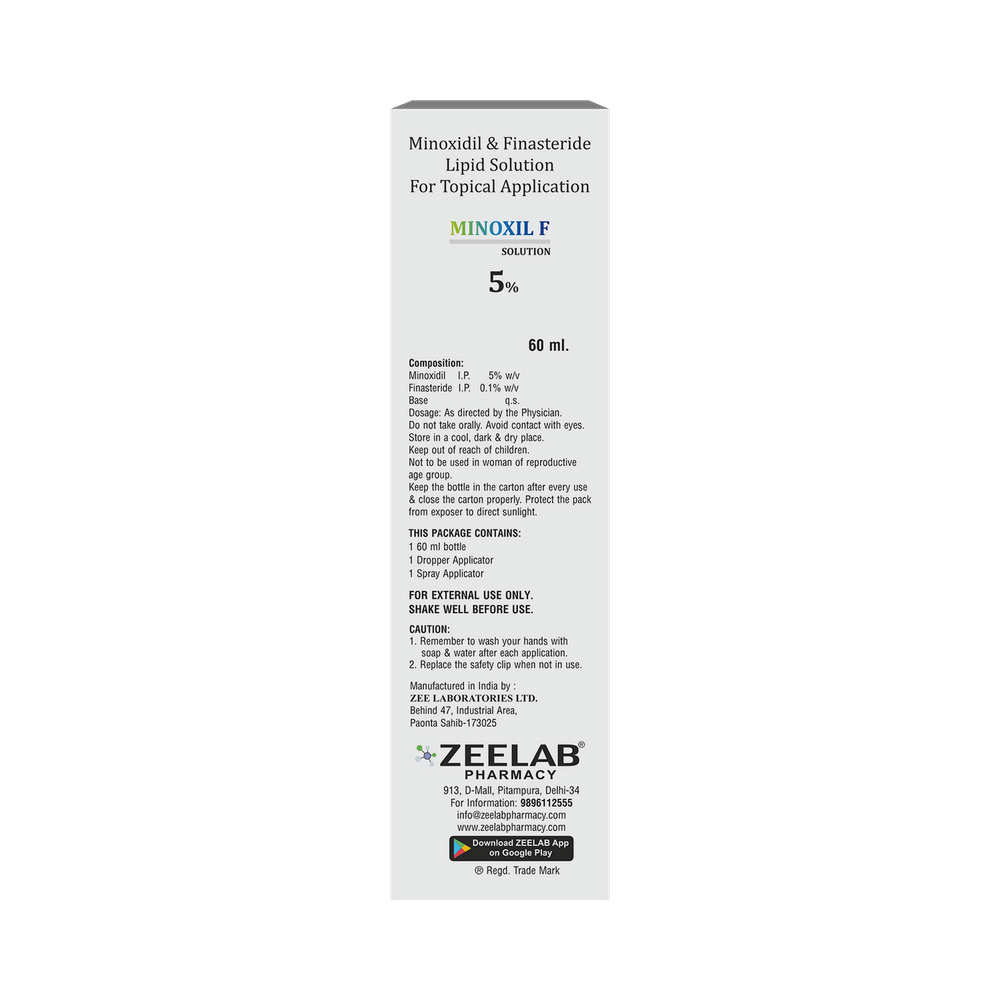 Minoxil F 5% Solution is a combination medicine used in the treatment of hair loss in men. It works by increasing blood flow to the hair follicles, which further prevents hair loss and stimulates re-growth, resulting in longer, thicker, and increased numbers of hair. Use Minoxil F 5% Solution in the dose and duration as prescribed by your doctor or as instructed on the label. Clean and dry your scalp before using it. It may take several months before you notice any hair growth. The first growth could be soft, colorless, and barely visible. Use it in the exact dose and duration as prescribed by your doctor. Using more than recommended will not speed up hair growth and may increase the likelihood of side effects. Use it for as long as the doctor has prescribed to maintain proper hair growth. If your condition does not improve after using it for 4 to 6 months, tell your doctor. This medicine is to be used only by men and is not indicated in women.Common side effects of this medicine include application site reactions, dry skin, impotence, decreased libido, ejaculation disorders, breast enlargement, breast tenderness in males, and skin rash. In case of accidental contact with other parts of the body, it may cause excessive hair growth. If you get it in your eyes, mouth, or broken skin, rinse thoroughly with plenty of water. Talk to your doctor if you are bothered by side effects or they do not go away.To ensure its safety, before using this medicine, let your doctor know if you have any problems with your heart. Additionally, inform your doctor about all the medicines you are taking. Pregnant, potentially pregnant, or breastfeeding women should not handle this medicine because of the possibility of absorption of finasteride. As it may cause potential harm to a male baby or fetus.