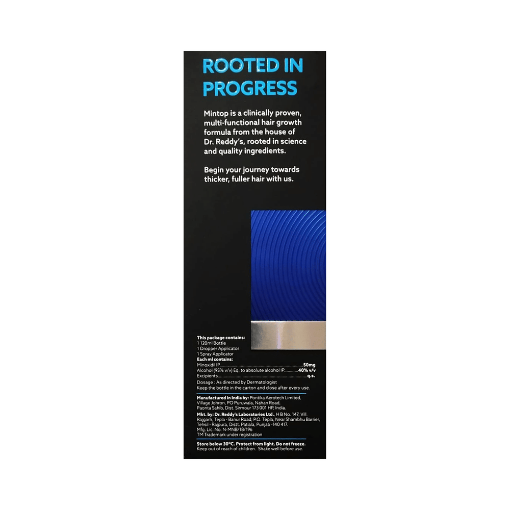 MINtop Forte 5% Minoxidil Solution belongs to a class of drugs known as vasodilators. It is used to promote hair growth in men with male pattern baldness by improving blood flow to hair follicles, helping slow hair loss, and encouraging new hair growth when used regularly. MINtop Forte 5% Minoxidil Solution should only be applied directly to the scalp area in the amount and in the way specified on the label or by your doctor. Clean and dry your scalp before using it. It may take approximately 2- 4 months to notice any hair growth. The first growth may be soft, colourless, and barely visible. Using more than recommended will not speed up hair growth and may increase the likelihood of side effects. This medication must be used continuously to maintain hair growth. Tell your doctor if your condition does not improve or worsen after using it for 4 to 6 months.The most common side effects of this medicine include itching, excessive hair growth, rash, and dermatitis. In case of accidental application in other areas, it may result in unwanted hair growth. Rinse thoroughly with plenty of water if you get it in your eyes, mouth, or broken skin. Talk to your doctor if you are bothered by the side effects or if they do not go away.People under 18 or over 65 should not usually use MINtop Forte 5% Minoxidil Solution. It may also not be appropriate if your hair loss is due to medications (such as chemotherapy) or any nutritional deficiency. You should also not use this medicine if you have high blood pressure or use other creams or lotions to treat other scalp conditions. Talk to your doctor if you have heart disease or blood circulation problems.