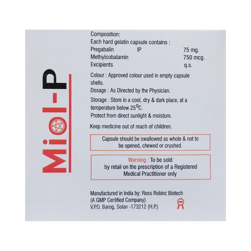 Miol-P Capsule is a prescription medicine used for the treatment of neuropathic pain. It decreases pain by modulating the calcium channel activity of the nerve cells. This medicine also protects nerve fibers and heals damaged nerve cells. Miol-P Capsule may be taken with or without food, preferably at bedtime. It is advised to take it at the same time each day as this helps to maintain a consistent level of medicine in the body. Take this medicine in the dose and duration advised by your doctor. If you miss a dose of this medicine, take it as soon as you remember. Finish the full course of treatment even if you feel better. This medication must not be stopped suddenly without talking to the doctor.Some common side effects of this medicine include nausea, vomiting, diarrhea, constipation, blurred vision, dizziness, and sleepiness. Do not drive or do anything that requires mental focus until you know how this medicine affects you. The side effects are mild and usually improve with time. It may also cause weight gain in some people. Exercise regularly and have a balanced diet to keep your weight in check. Inform your doctor if you develop any unusual changes in mood or behavior, new or worsening depression, or suicidal thoughts.Your doctor should also know about all other medicines you are taking, as many of these may make this medicine less effective or change the way it works. Inform your doctor if you are pregnant, planning pregnancy, or breastfeeding to make sure it is safe for you and the developing baby.
