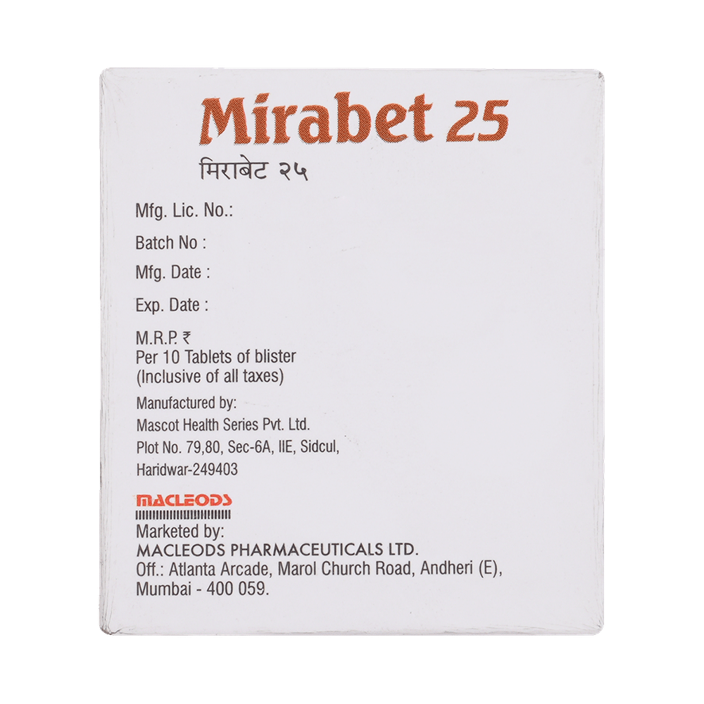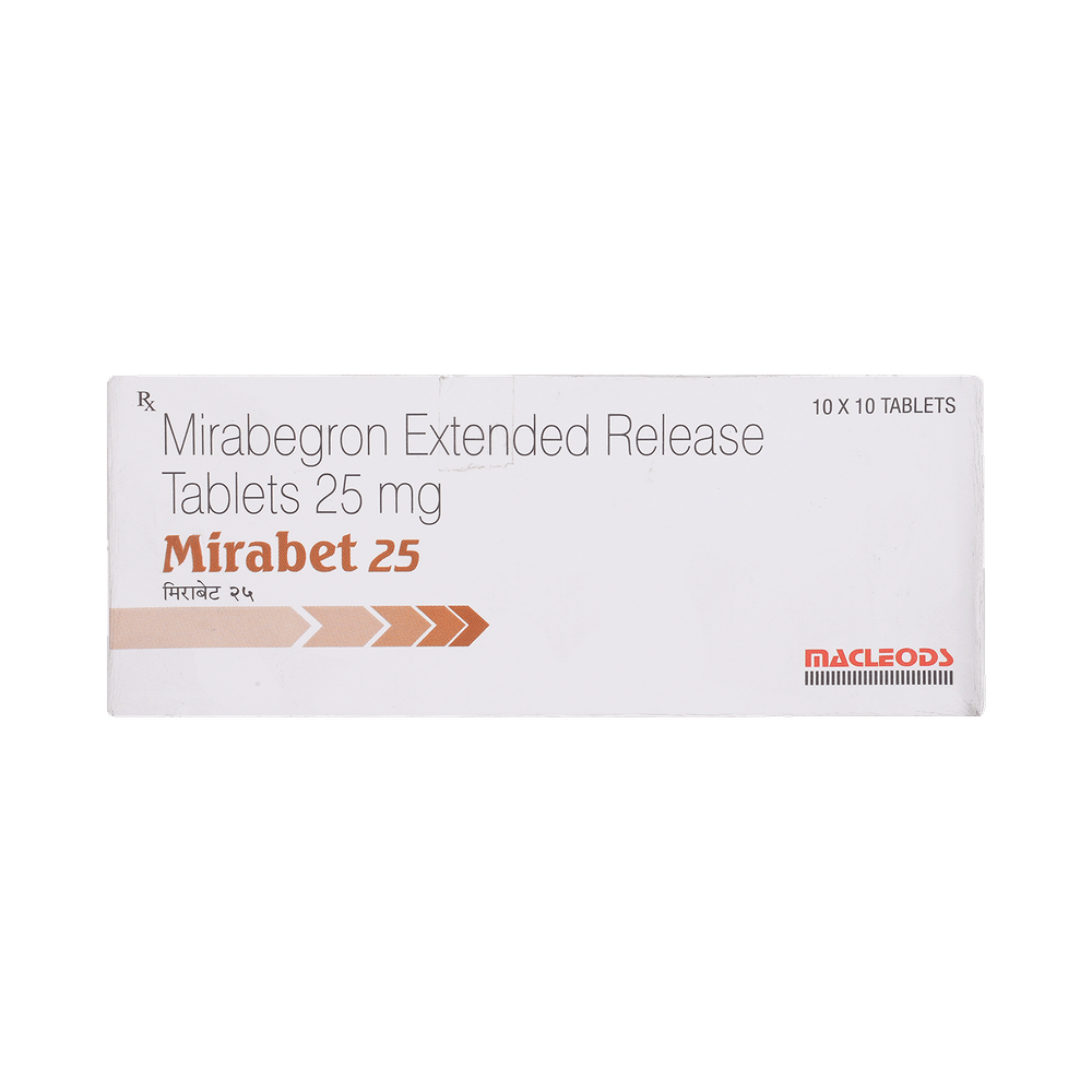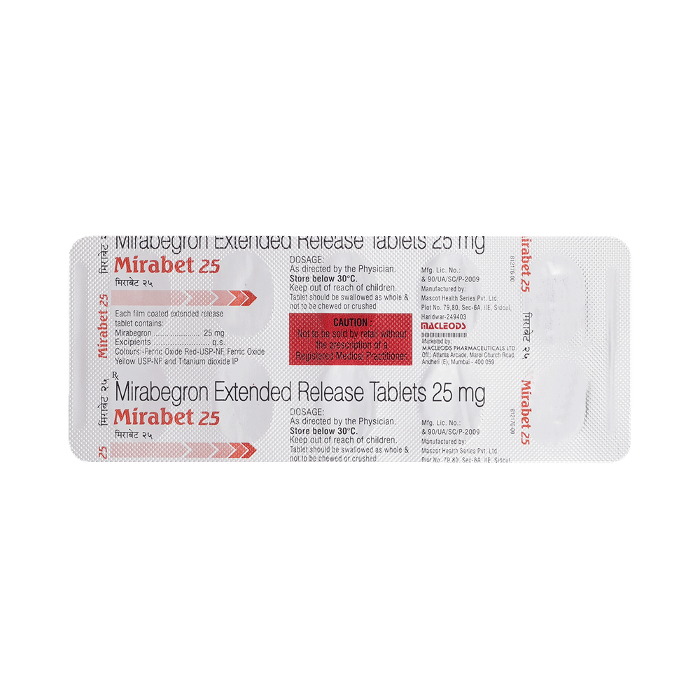 Mirabet 25 Tablet ER is used to treat symptoms of overactive bladder that includes increased or frequent urination, urgent need to urinate and inability to control urination. It helps to relax the muscle surrounding the bladder and increase it's ability to store urine. Mirabet 25 Tablet ER is advised to take it in a dose and duration as per prescription. It can be taken with or without food. Swallow the medicine as a whole without crushing or chewing it. You should not stop taking the medicine without consulting the doctor as it may lead to the worsening of your symptoms. The course of the treatment should be completed for better efficacy of the medicine.Some common side effects of this medicine are constipation, headache, high blood pressure, nasal inflammation, urinary tract infection, rapid heartbeat, and joint pain. If any of the side effects bother you or persist, consult the doctor without delay.Before receiving the treatment, inform your doctor if you are on any medication for any other health condition. If you are pregnant or breastfeeding, tell your doctor prior to the treatment. Patients with liver or kidney disease must be cautious while receiving the prescription and they must receive regular follow-ups as per the doctor’s advice.