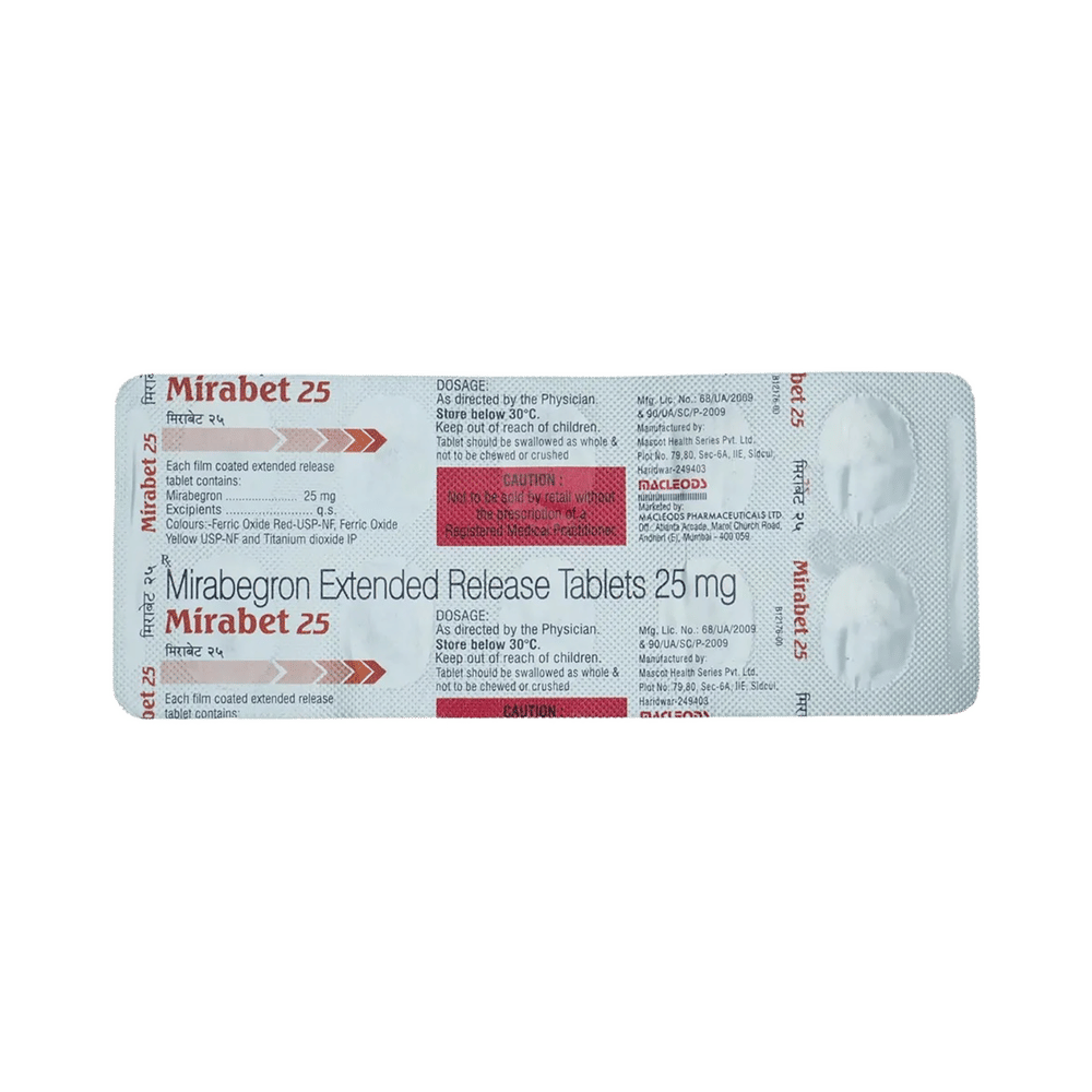 Mirabet S 25mg/5mg Tablet ER is a combination of two medicines used in the treatment of the symptoms of an overactive bladder. It relieves urinary symptoms like frequent urination, urgent need to urinate and inability to control urination. Mirabet S 25mg/5mg Tablet ER is advised to be taken in the dose and duration as prescribed by your doctor. It may be taken with or without food, preferably at the same time each day. You should not stop taking the medicine without consulting the doctor as it may lead to the worsening of your symptoms. The course of the treatment should be completed for better efficacy of the medicine.Some of the common side effects of this medicine are hypertension (high blood pressure), nasopharyngitis (inflammation of the throat and nasal passages), urinary tract infection, and headache. If any of the side effects bother you or persist, consult the doctor without delay.Before receiving the treatment, inform your doctor if you are on any medication for any other health condition. If you are pregnant or breastfeeding, tell your doctor prior to the treatment. People with liver or kidney disease must be cautious while receiving the prescription and they must receive regular follow-ups as per the doctor’s advice.