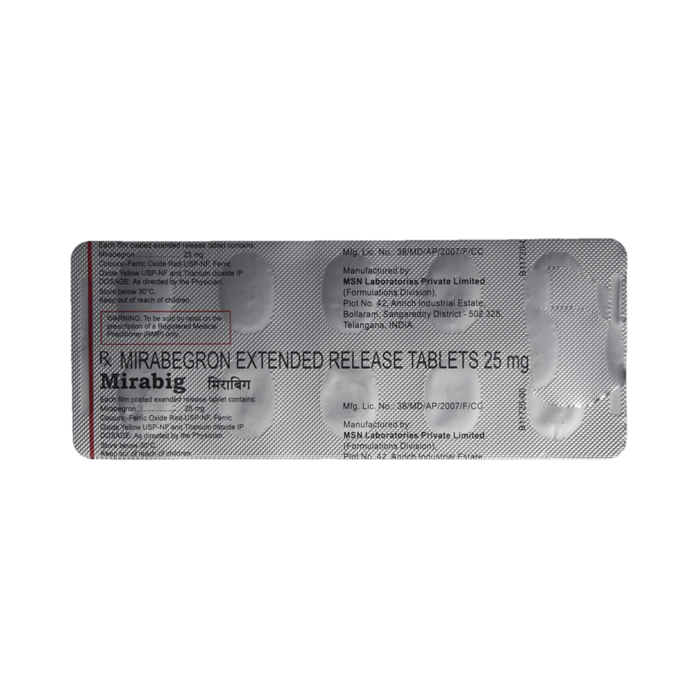 Mirabig 25mg Tablet ER is used to treat symptoms of overactive bladder that includes increased or frequent urination, urgent need to urinate and inability to control urination. It helps to relax the muscle surrounding the bladder and increase it's ability to store urine. Mirabig 25mg Tablet ER is advised to take it in a dose and duration as per prescription. It can be taken with or without food. Swallow the medicine as a whole without crushing or chewing it. You should not stop taking the medicine without consulting the doctor as it may lead to the worsening of your symptoms. The course of the treatment should be completed for better efficacy of the medicine.Some common side effects of this medicine are constipation, headache, high blood pressure, nasal inflammation, urinary tract infection, rapid heartbeat, and joint pain. If any of the side effects bother you or persist, consult the doctor without delay.Before receiving the treatment, inform your doctor if you are on any medication for any other health condition. If you are pregnant or breastfeeding, tell your doctor prior to the treatment. Patients with liver or kidney disease must be cautious while receiving the prescription and they must receive regular follow-ups as per the doctor’s advice.
