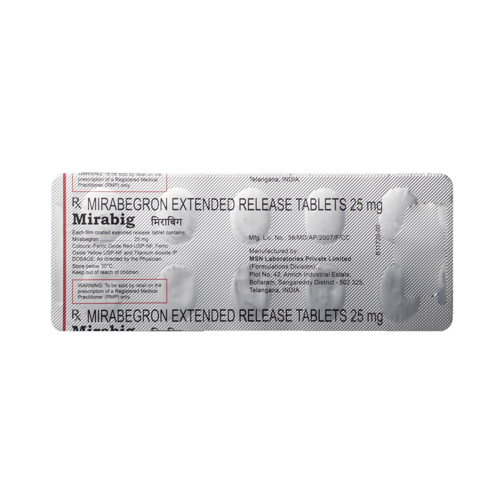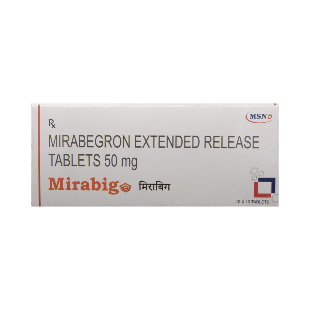 Mirabig 50mg Tablet ER is used to treat symptoms of overactive bladder that includes increased or frequent urination, urgent need to urinate and inability to control urination. It helps to relax the muscle surrounding the bladder and increase it's ability to store urine. Mirabig 50mg Tablet ER is advised to take it in a dose and duration as per prescription. It can be taken with or without food. Swallow the medicine as a whole without crushing or chewing it. You should not stop taking the medicine without consulting the doctor as it may lead to the worsening of your symptoms. The course of the treatment should be completed for better efficacy of the medicine.Some common side effects of this medicine are constipation, headache, high blood pressure, nasal inflammation, urinary tract infection, rapid heartbeat, and joint pain. If any of the side effects bother you or persist, consult the doctor without delay.Before receiving the treatment, inform your doctor if you are on any medication for any other health condition. If you are pregnant or breastfeeding, tell your doctor prior to the treatment. Patients with liver or kidney disease must be cautious while receiving the prescription and they must receive regular follow-ups as per the doctor’s advice.