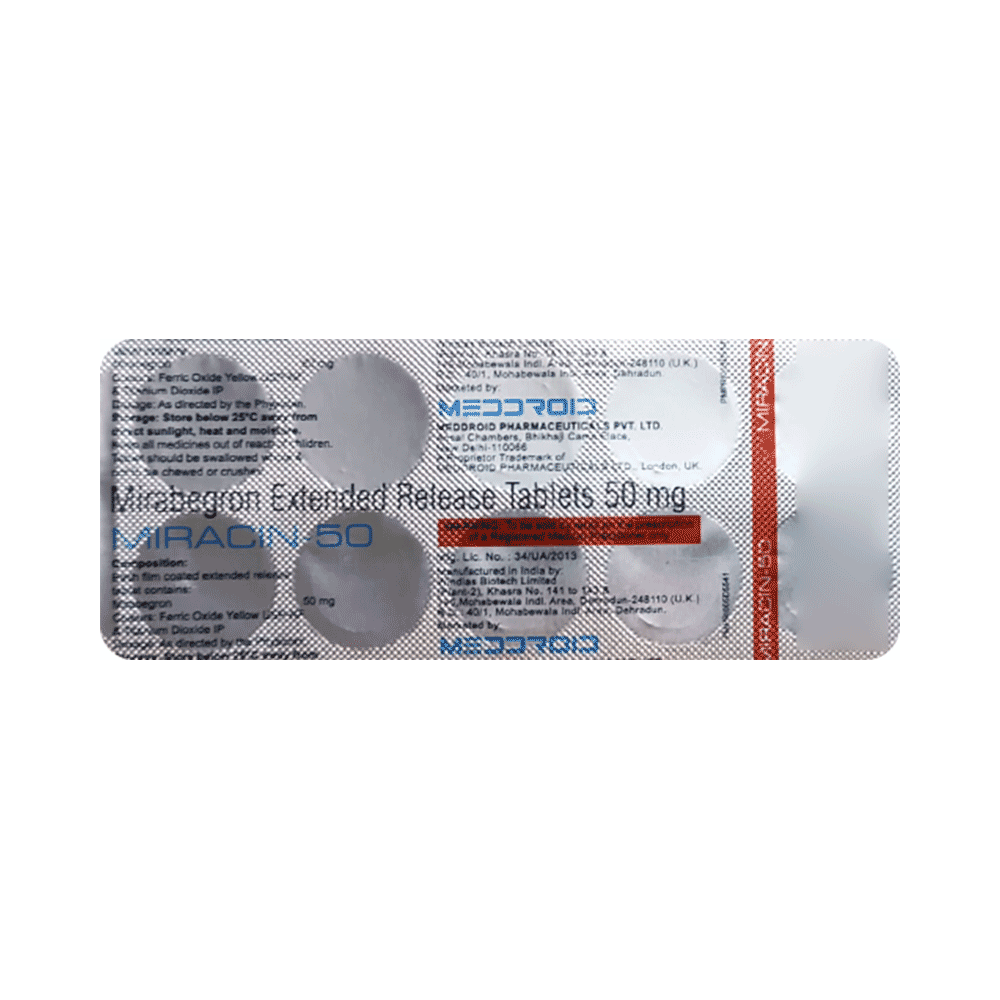 Miracin 50 Tablet ER is a beta 3-receptor agonist. It works by activating the receptor in the bladder, causing the bladder muscles to relax. It prevents frequent, urgent or uncontrolled urination.