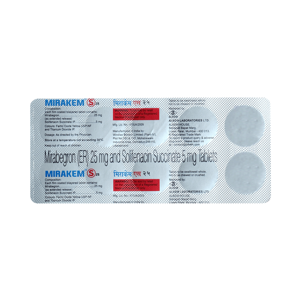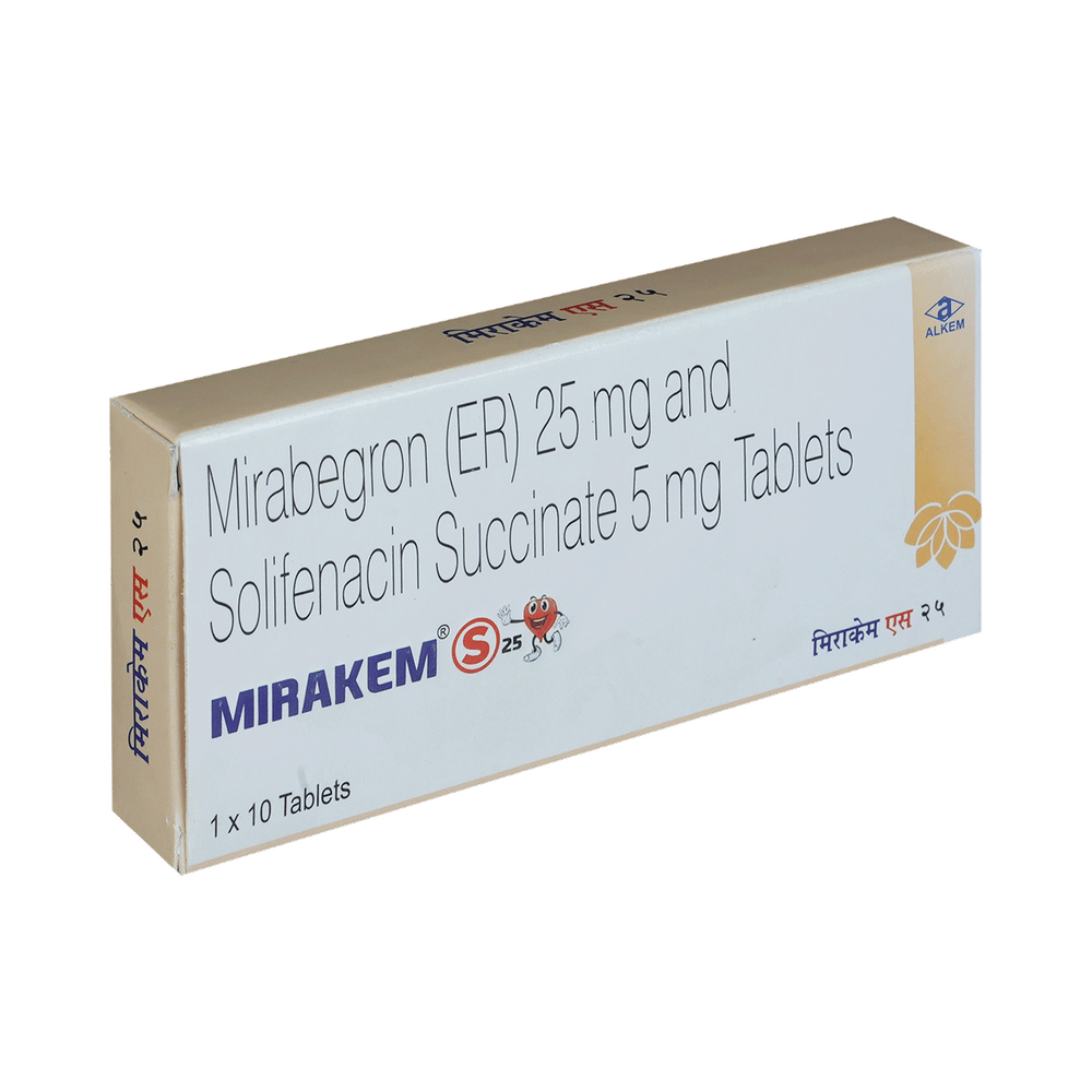 Mirakem S 25mg/5mg Tablet is a combination of two medicines used in the treatment of the symptoms of an overactive bladder. It relieves urinary symptoms like frequent urination, urgent need to urinate and inability to control urination. Mirakem S 25mg/5mg Tablet is advised to be taken in the dose and duration as prescribed by your doctor. It may be taken with or without food, preferably at the same time each day. You should not stop taking the medicine without consulting the doctor as it may lead to the worsening of your symptoms. The course of the treatment should be completed for better efficacy of the medicine.Some of the common side effects of this medicine are hypertension (high blood pressure), nasopharyngitis (inflammation of the throat and nasal passages), urinary tract infection, and headache. If any of the side effects bother you or persist, consult the doctor without delay.Before receiving the treatment, inform your doctor if you are on any medication for any other health condition. If you are pregnant or breastfeeding, tell your doctor prior to the treatment. People with liver or kidney disease must be cautious while receiving the prescription and they must receive regular follow-ups as per the doctor’s advice.