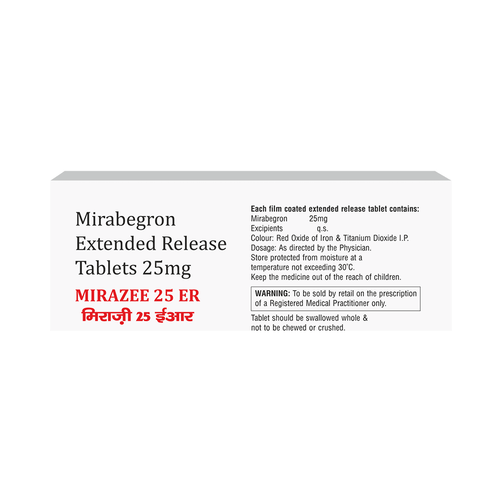 Mirazee 25 ER Tablet is used to treat symptoms of overactive bladder that includes increased or frequent urination, urgent need to urinate and inability to control urination. It helps to relax the muscle surrounding the bladder and increase it's ability to store urine. Mirazee 25 ER Tablet is advised to take it in a dose and duration as per prescription. It can be taken with or without food. Swallow the medicine as a whole without crushing or chewing it. You should not stop taking the medicine without consulting the doctor as it may lead to the worsening of your symptoms. The course of the treatment should be completed for better efficacy of the medicine.Some common side effects of this medicine are constipation, headache, high blood pressure, nasal inflammation, urinary tract infection, rapid heartbeat, and joint pain. If any of the side effects bother you or persist, consult the doctor without delay.Before receiving the treatment, inform your doctor if you are on any medication for any other health condition. If you are pregnant or breastfeeding, tell your doctor prior to the treatment. Patients with liver or kidney disease must be cautious while receiving the prescription and they must receive regular follow-ups as per the doctor’s advice.