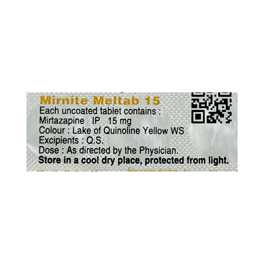 Mirnite Meltab 15 Tablet DT is used in the treatment of depression. This medicine works by increasing the level of chemical messengers (serotonin and noradrenaline) in the brain that help calm the brain and relax the nerves, thus treating your depression. Mirnite Meltab 15 Tablet DT may be taken with or without food. It is advised to take this medicine at a fixed time each day to maintain a consistent level in the blood. If you miss any doses, take it as soon as you remember. Do not skip any doses and finish the full course of treatment even if you feel better. It is important that this medication is not stopped suddenly as it may worsen your symptoms.Some common side effects of this medicine include dryness in the mouth, increased appetite, and headaches. It even causes dizziness and sleepiness, so do not drive or do anything that requires mental focus until you know how this medicine affects you. This medicine may cause weight gain; therefore, you should have a balanced diet and exercise regularly. Moreover, it is important to inform your doctor if you develop a sore throat or fever after taking this medicine.