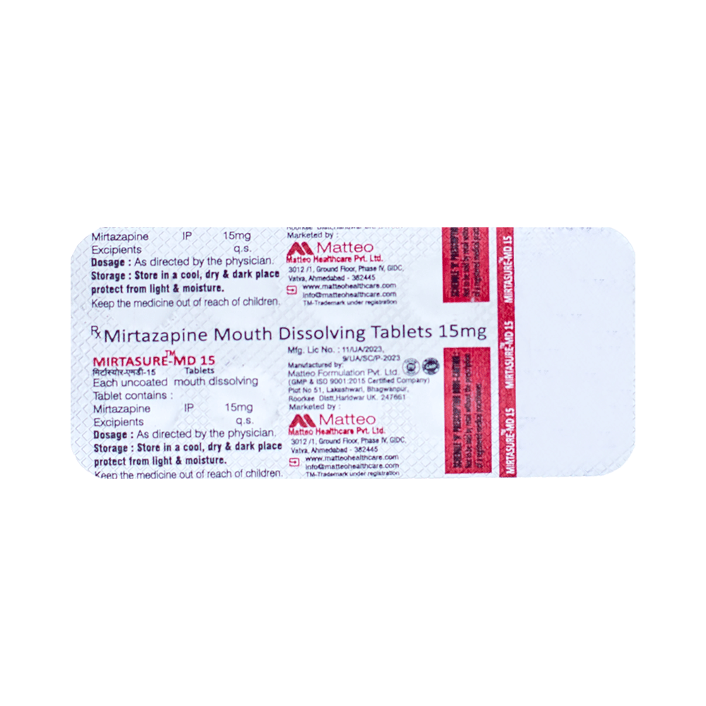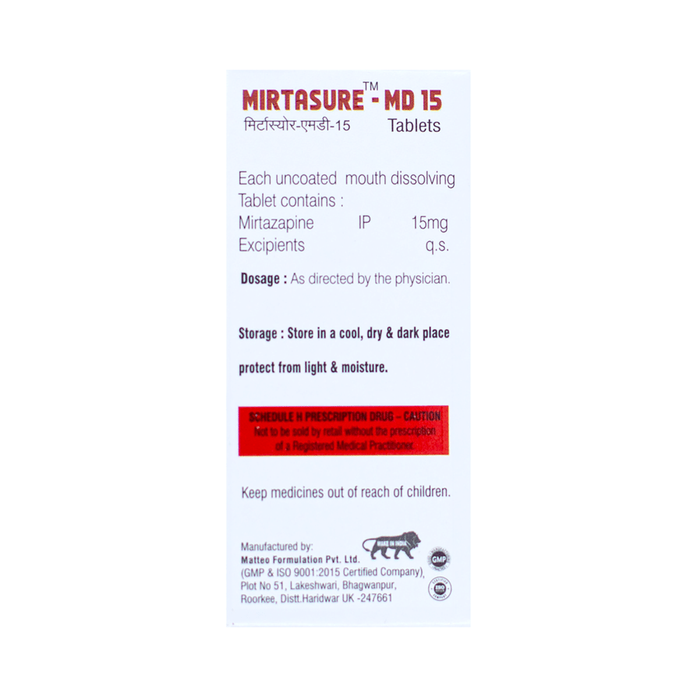 Mirtasure-MD 15 Tablet is used in the treatment of depression. This medicine works by increasing the level of chemical messengers (serotonin and noradrenaline) in the brain that help calm the brain and relax the nerves, thus treating your depression. Mirtasure-MD 15 Tablet may be taken with or without food. It is advised to take this medicine at a fixed time each day to maintain a consistent level in the blood. If you miss any doses, take it as soon as you remember. Do not skip any doses and finish the full course of treatment even if you feel better. It is important that this medication is not stopped suddenly as it may worsen your symptoms.Some common side effects of this medicine include dryness in the mouth, increased appetite, and headaches. It even causes dizziness and sleepiness, so do not drive or do anything that requires mental focus until you know how this medicine affects you. This medicine may cause weight gain; therefore, you should have a balanced diet and exercise regularly. Moreover, it is important to inform your doctor if you develop a sore throat or fever after taking this medicine.