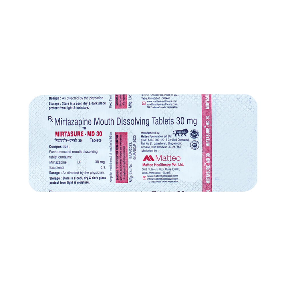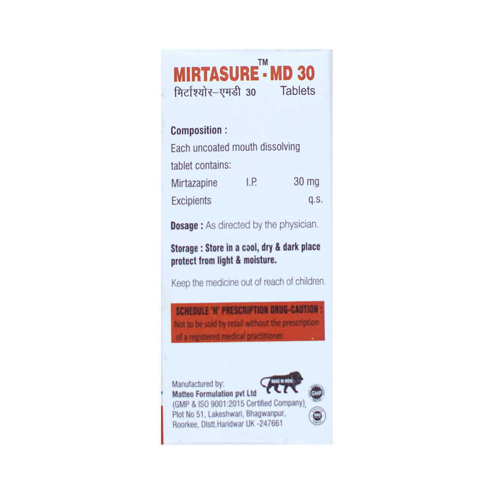 Mirtasure-MD 30 Tablet is used in the treatment of depression. This medicine works by increasing the level of chemical messengers (serotonin and noradrenaline) in the brain that help calm the brain and relax the nerves, thus treating your depression. Mirtasure-MD 30 Tablet may be taken with or without food. It is advised to take this medicine at a fixed time each day to maintain a consistent level in the blood. If you miss any doses, take it as soon as you remember. Do not skip any doses and finish the full course of treatment even if you feel better. It is important that this medication is not stopped suddenly as it may worsen your symptoms.Some common side effects of this medicine include dryness in the mouth, increased appetite, and headaches. It even causes dizziness and sleepiness, so do not drive or do anything that requires mental focus until you know how this medicine affects you. This medicine may cause weight gain; therefore, you should have a balanced diet and exercise regularly. Moreover, it is important to inform your doctor if you develop a sore throat or fever after taking this medicine.