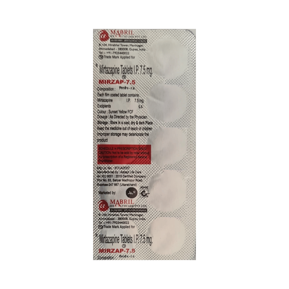 Mirzap 7.5 Tablet is used in the treatment of depression. This medicine works by increasing the level of chemical messengers (serotonin and noradrenaline) in the brain that help calm the brain and relax the nerves, thus treating your depression. Mirzap 7.5 Tablet may be taken with or without food. It is advised to take this medicine at a fixed time each day to maintain a consistent level in the blood. If you miss any doses, take it as soon as you remember. Do not skip any doses and finish the full course of treatment even if you feel better. It is important that this medication is not stopped suddenly as it may worsen your symptoms.Some common side effects of this medicine include dryness in the mouth, increased appetite, and headaches. It even causes dizziness and sleepiness, so do not drive or do anything that requires mental focus until you know how this medicine affects you. This medicine may cause weight gain; therefore, you should have a balanced diet and exercise regularly. Moreover, it is important to inform your doctor if you develop a sore throat or fever after taking this medicine.
