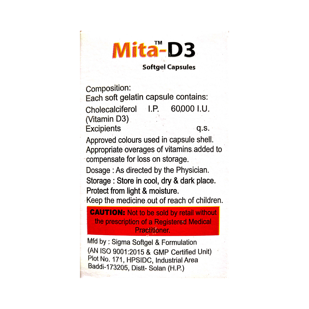 Mita-D3 Softgel Capsule is a form of vitamin D. It raises vitamin D levels in your blood. This, in turn, increases calcium levels in your blood by helping you absorb more calcium from food.