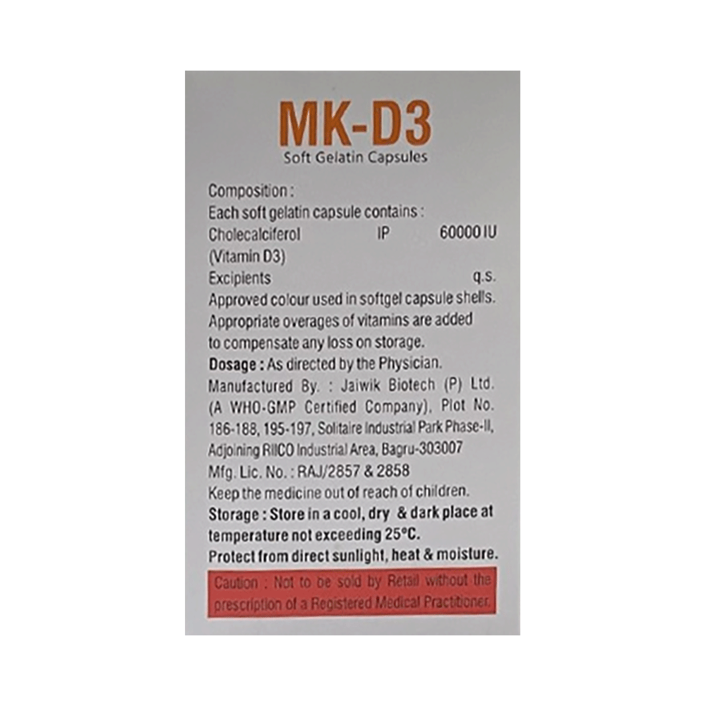 MK-D3 Soft Gelatin Capsule is used in the treatment of vitamin D deficiency and osteoporosis. It helps the body to absorb calcium. Calcium is essential for maintaining strong and healthy bones. It is used when your diet does not provide enough calcium. MK-D3 Soft Gelatin Capsule should be taken as directed by your doctor. It is best taken with or after food, as this helps your body absorb it, and you should take it regularly to get the most benefits. If you are using it to treat osteoporosis, you will also be prescribed other medicines. This medicine may be only part of a complete treatment program that includes making changes to your diet and taking calcium and vitamin supplements. Learn about the foods you should eat to ensure you get enough calcium and vitamin D.MK-D3 Soft Gelatin Capsule has few side effects, and none are common. If you take too much, you may feel weakness, muscle pain, or a metallic taste in your mouth. If you experience any such side effects, speak with your doctor. They may be able to help you reduce or treat the symptoms.Before taking this medicine, tell your doctor if you have high calcium levels in your blood or if you have any heart, kidney, or liver disease. Some other medicines can decrease the absorption of vitamin D3, so let your doctor know about all the other medicines you are taking to make sure you are safe. This medicine may help during pregnancy when your body needs more vitamin D, but too much could harm your baby. Discuss it with your doctor.