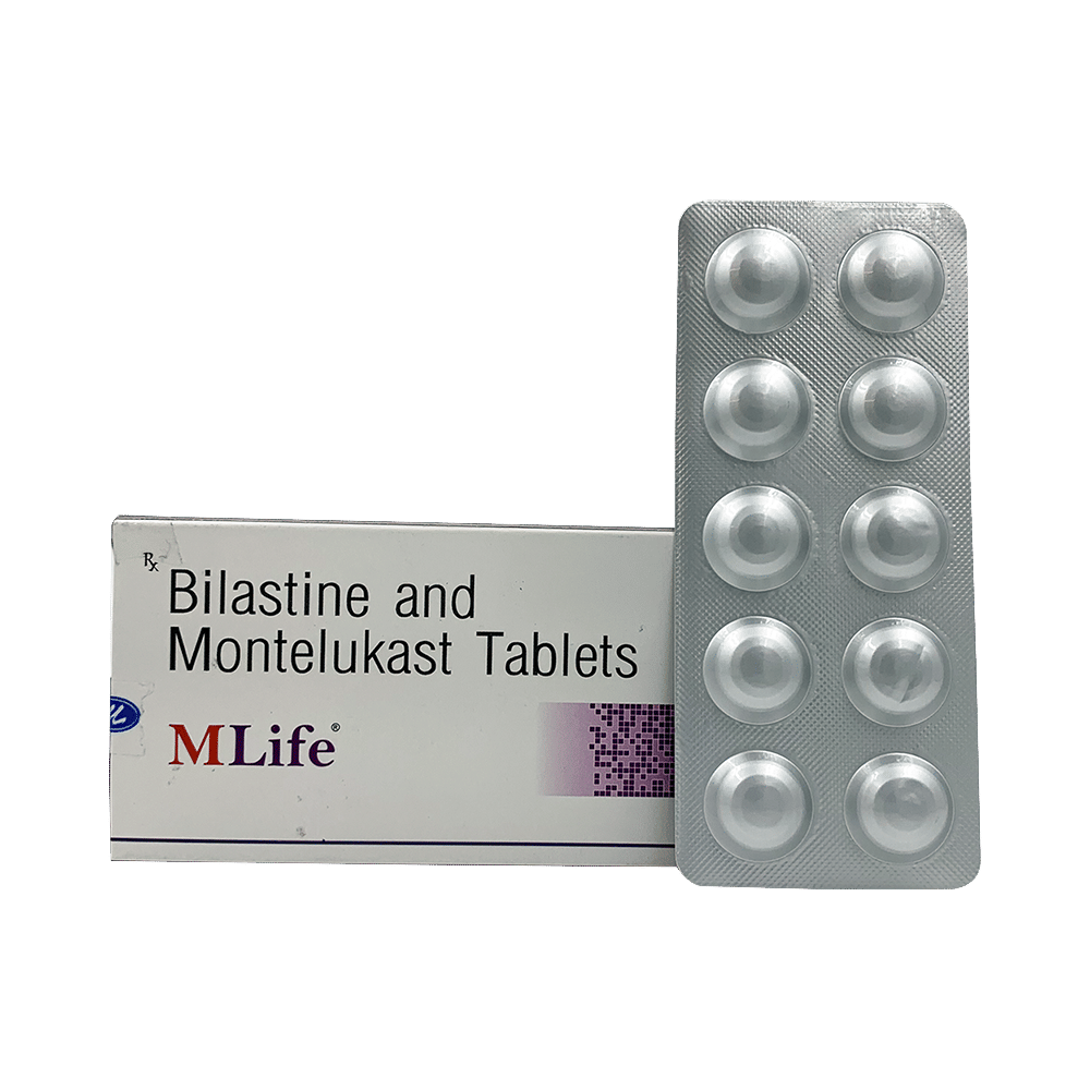 Mlife Tablet is a combination of two medicines: bilastine and montelukast. Bilastine is an antiallergic medication. It treats allergy symptoms such as itching, swelling, and rashes by blocking the effects of a chemical messenger (histamine) in the body. Montelukast works by blocking the action of leukotriene, a chemical messenger. This reduces inflammation in the airways to relieve symptoms of allergies.