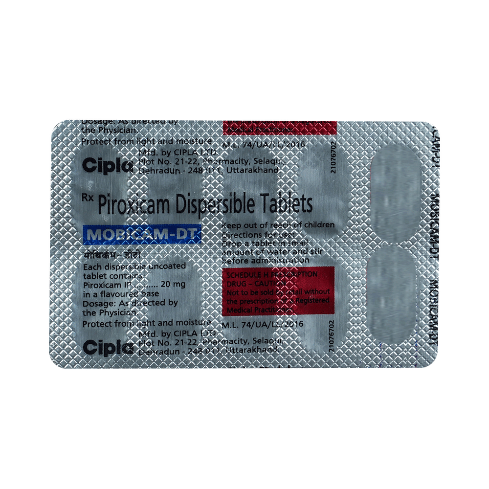In Pain reliefMobicam 20mg Tablet DT is used for short-term relief of pain, inflammation, and swelling in conditions that affect joints and muscles. It works by blocking chemical messengers in the brain that tell us we have pain. It can help relieve pain in conditions like rheumatoid arthritis and osteoarthritis or even after a dental (tooth-related) surgery.Take it as it is prescribed to get the most benefit. Do not take more or for longer than needed as that can be dangerous. In general, you should take the lowest dose that works, for the shortest possible time. This will help you to go about your daily activities more easily and have a better, more active, quality of life.