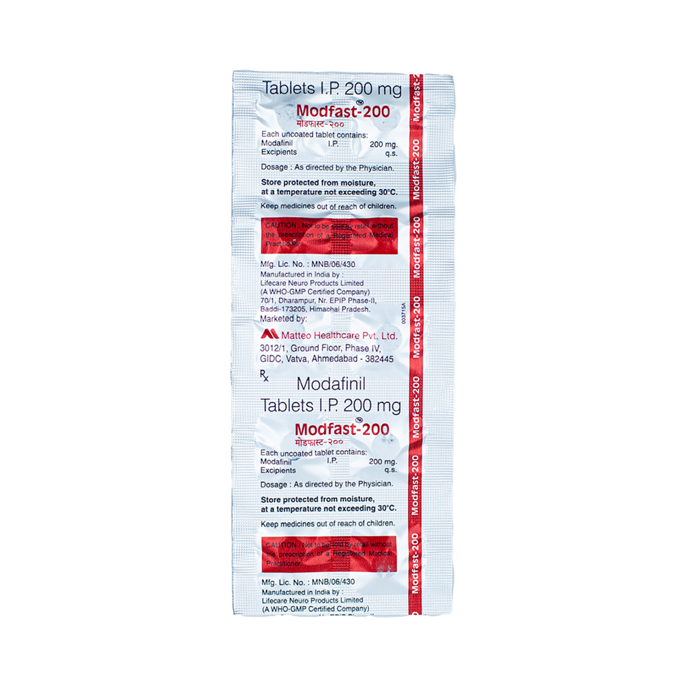 Modfast 200 Tablet is a medicine used in the treatment of excessive daytime sleepiness (narcolepsy). It promotes wakefulness and helps you to stay awake. Thereby, reducing the tendency to fall asleep during the day and restoring the normal sleep cycle. Modfast 200 Tablet improves sleep pattern.