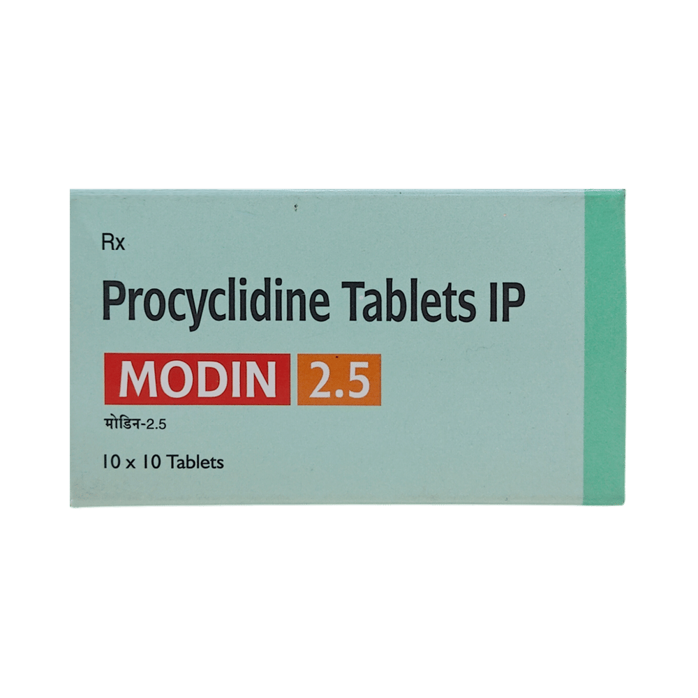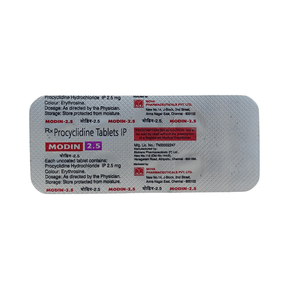 Modin 2.5 Tablet is a prescription medicine used in the treatment of Parkinson's disease and drug-induced abnormal movements. It helps by improving muscle control and reducing the stiffness of the muscles so that they can move easily. Modin 2.5 Tablet should be taken with food as it reduces the side effects with this medicine. It should be taken at the same time each day, this helps to maintain a consistent level of medicine in the body. Take this medicine in the dose and duration as advised by your doctor and if you have missed a dose, take it as soon as you remember. Do not skip any doses and finish the full course of treatment even if you feel better. This medication mustn't be stopped suddenly without talking to the doctor as it may result in a worsening of symptoms.Some common side effects of this medicine include dilation of the pupil, blurring of vision, lightheadedness, nausea, vomiting, epigastric pain, and constipation. It also causes dizziness, so do not drive or do anything that requires mental focus until you know how this medicine affects you. Dry mouth may occur commonly while using this medicine so, try to do frequent mouth rinses, maintain good oral hygiene, and increase water intake. Avoid wearing contact lenses as it may cause dry eyes as well. It is important to inform your doctor if you suffer from glaucoma or have trouble passing urine.Before using Modin 2.5 Tablet, you should tell your doctor if you've ever had heart problems, problems with passing urine, liver or kidney disease. It may also affect, or be affected by, some other drugs you are using so let your doctor know what these are to be safe. Pregnant or breastfeeding mothers should consult their doctor before starting treatment with this medicine.
