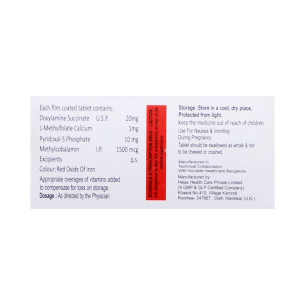 Salt Composition: Doxylamine (20mg) + Vitamin B6 (Pyridoxine) (10mg) + L-Methyl Folate Calcium (1mg) + Methylcobalamin (1500mcg)