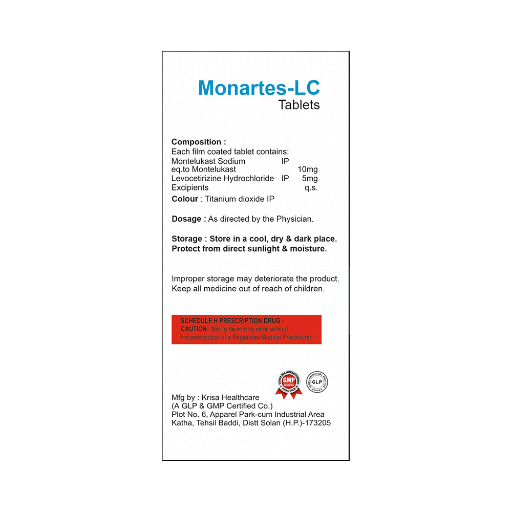 In Treatment of Allergic skin conditionsMonartes-LC Tablet is effective in treating allergic skin conditions with inflammation and itching. It reduces the actions of chemicals in the body that cause inflammation of the skin. When used correctly it is a safe and effective treatment. It reduces the redness, rash, pain or itchiness caused by your skin’s reaction to an irritant. It thus improves your self-esteem and confidence as your appearance changes. Keep taking it for as long as it is prescribed to get the full benefits.In Treatment of Sneezing and runny nose due to allergiesMonartes-LC Tablet is a combination medicine that provides relief from symptoms such as blocked or runny nose, sneezing and itchy or watery eyes. This will make it easier for you to go about your daily activities. It rarely has any serious side effects and you may only need to take it on days you have symptoms. If you are taking it to prevent getting symptoms you should use it regularly to get the most benefit.In Treatment of Hay feverHay fever, also called allergic rhinitis, causes cold-like signs and symptoms, such as a runny nose, itchy eyes, congestion, sneezing and sinus pressure. The only difference is that in hay fever, these symptoms are not produced due to a virus but are simply allergic responses of our body to allergens (allergy causing agents such as pollen). Monartes-LC Tablet is used to provide relief from these symptoms of hay fever. It works by blocking the release of the chemical substance responsible for producing such allergy symptoms. Monartes-LC Tablet is a safe medicine which helps treat hay fever and makes us feel at ease.show moreshow less