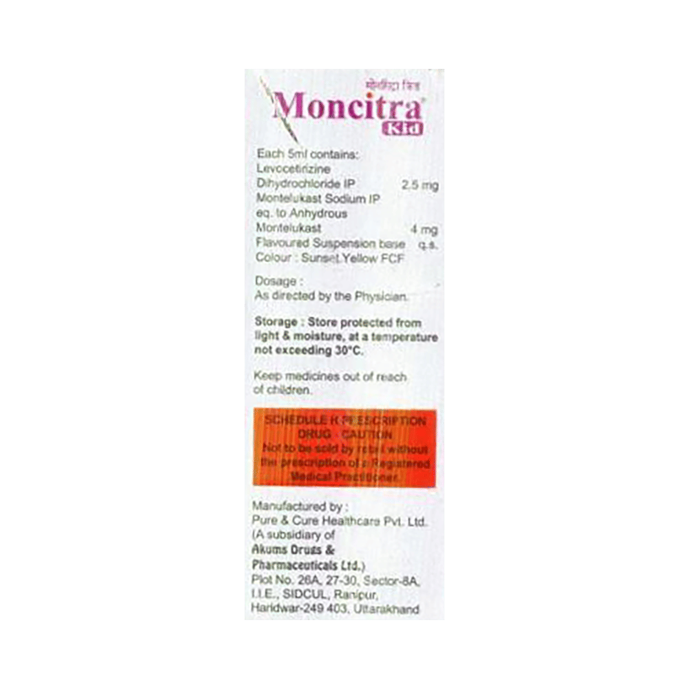 Moncitra Kid Oral Suspension is commonly prescribed in children to treat symptoms of allergy such as runny nose, sneezing, itching, swelling, congestion, and watery eyes. It may also help in the treatment of asthma and skin allergies. Give this medicine to your child at a fixed time before or after food in the prescribed dose, time, and way. For asthma, prefer giving Moncitra Kid Oral Suspension in the evening or 2 hours before physical activity. For allergy, it is best to give it either in the morning or in the evening, depending upon the time of onset of symptoms. In case your child has both, prefer giving it in the evening. If your child vomits within 30 minutes of taking this medicine, give the same dose again, but skip it if it’s already time for the next dose.Your child may start to feel better after a few regular doses. However, you must still complete the prescribed dose to ensure maximum benefit. Moreover, stopping the medicine abruptly may worsen your child’s condition. This medicine may cause some minor and temporary side effects like vomiting, diarrhea, nausea, dizziness, dry mouth, rash, and headache. Usually, these episodes subside once your child’s body adapts to the medicine. However, in case these effects persist or start bothering your child, consult your child’s doctor without any delay.Let your child’s doctor know if your child is already taking any medicines. Also, narrate your child’s complete medical history, including any prior episodes of allergy, heart problem, blood disorder, vascular disorders, birth defects, airway obstruction, lung anomaly, skin disorder, liver impairment, and kidney malfunction. This information is critical for dose alterations and in planning your child’s overall treatment.